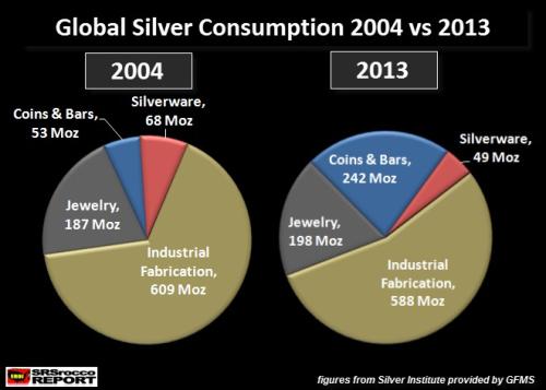 在過去10年的白銀需求中,銀幣和銀條投資需求的增長是非常顯著的,不過外界多關注工業需求,而投資需求則有所減弱。![]() (棕色:工業應用;灰色:銀飾;藍色:銀幣銀條;紅色:銀器) 英國商品研究機構(CRU)的報告顯示,2014年白銀的工業需求同比將上漲27%,到2018年更將額外增長1.42億盎司。 但GFMS的報告則有所不同,該機構的報告中稱,2014年白銀需求自2013年的5.377億盎司至5.297億盎司。 2004年中,工業應用的白銀需求為6.09億盎司,而銀幣和銀條投資需求則只有5300萬盎司。 十年之后,白銀的工業需求下降到了5.88億盎司,銀幣和銀條的投資需求卻大幅上漲到了2.42億盎司。 盡管工業應用的白銀需求下降主要是因為攝影應用的減少,但銀幣和銀條顯然是大贏家。 如果移除攝影應用,那么白銀的工業應用在2004至2013年間上漲了15%,而銀幣和銀條需求則大漲了357%。 此外,盡管銀飾需求自2004年的1.87億盎司增長到了2013年的1.98億盎司,但銀幣和銀條的需求目前已經超過了銀飾需求。 查看更多白銀投資趣事:投資白銀趣事