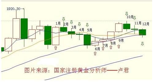 2012年黃金開盤價于1560.09美元/盎司。全年金價最低觸及1727美元/盎司。2012年全年一月份上漲幅度11.9%。二月份跌幅為2%。三月份金價延續下跌跌幅為1.5%;四月份跌幅0.3%。全年5月份的跌幅為最大6.3%觸及2012年內低點1527美元/盎司之后金價迎來四連陽,連續4個月展開反攻,整體反彈的幅度在13.6%。而后四個月金價再次展開震蕩下行。