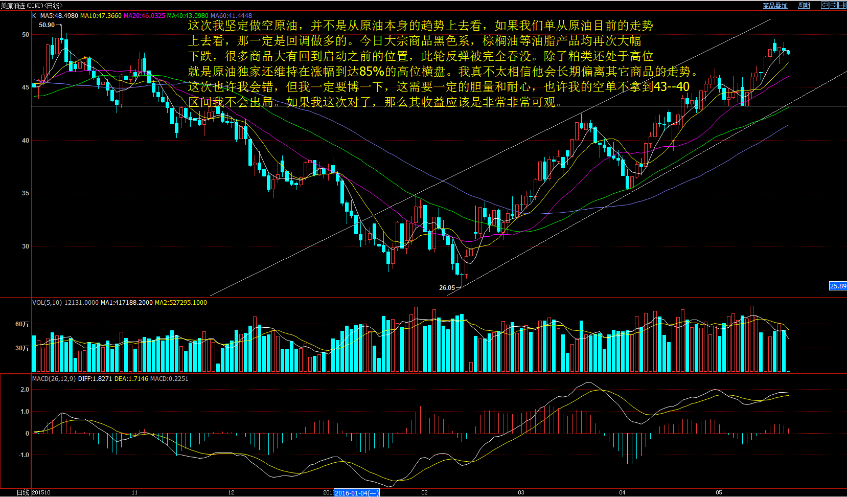 白銀上周五以上影線收盤,多頭力量明顯不足。雖然目前建議投資者在16.4附近介入多單,但該單主要以短線為主。目前從短期趨勢來看,并不是介入中長線多 單的時候,市場哪怕再次走強,都會有一個時間換空間的過程。個人還是認為后期行情維持寬幅震蕩的概率較大,其波動區間預計在16~17之間。所以,目前手 中持有多單應該在17區域做獲利了結,如果下跌至16區域可以繼續加倉。 對于紙白銀,投資者不要考慮市場會跌倒哪里,在目前的價格區間只要大跌就就行大買,在資金和時間夠的情況下,最終一定能夠獲利出局。紙白銀不建議做空。 下圖顯示目前銀價還處于下降通道之中,顯然調整行情還沒有結束,投資者繼續等待。近期可能迎來反彈,但反彈預計難以突破下降通道。 建議輕倉在16~16.4做多,目標17,多看少動。 再 來看看原油走勢,這次堅定在高位做空原油,并不是從原油本身的趨勢上看,如果我們單從原油目前的走勢分析,那一定是回調做多的。今日大宗商品再次下跌,很 多商品大有回到啟動之前的位置,此輪反彈被完全吞沒。目前原油和粕類處于高位,由于都屬于大宗商品,后期價格應該會出現一個回歸。在做好止損的前提下,投 資者可以嘗試博取一個空單,建議目標在40~43美元之間,其收益相對可觀。 建議在48~50繼續做空原油,目標40~43離場。