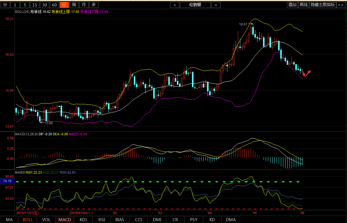 白銀日線上看,布林帶開呈開口狀,k線運行布林帶下軌附近,MA5與MA10雙線交死叉向下運行,附圖指標MACD雙線交死叉向下,綠色動能逐漸縮量。四小時走勢圖上看,布林帶張口向下,K線運行于中下軌之間,MA5與MA10雙線相交死叉運行;附圖指標MACD雙線交黏合運行于0軸下方,同時紅色能量柱放量;kdj指標向下發散;綜合來看,操作上低多為主。