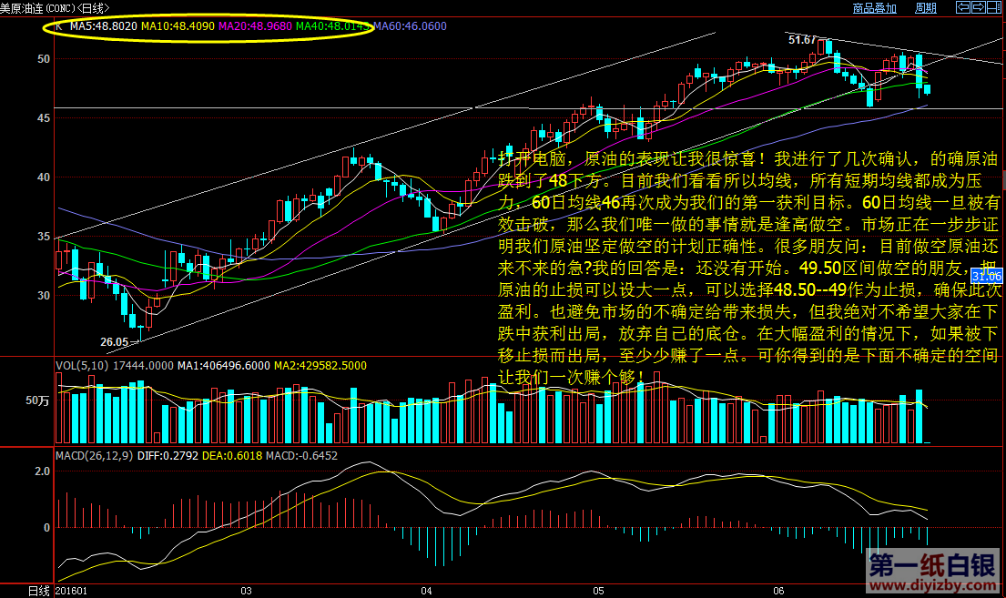 自上周五白銀出現(xiàn)大陽拉升之后,目前走勢一直維持在5日均線上方,昨日以長上下影線公投陽線收盤,市場表現(xiàn)仍然強勁,預計震蕩上行成為后市的主旋律。目前選擇做空并不是很好的策略,但面臨強壓區(qū)域,激進者追漲也不是最佳,建議目前投資者多以觀望為主,若見銀價出現(xiàn)回落采取分批加倉的方式即可。 正如下圖所示,目前白銀價格處于大趨勢上升通道之中,不過在18上方將有一定的壓力出現(xiàn),近期行情將再次沖擊18上方阻力位。 策略:若見回落分批做多,暫不做空。 再來看看原油走勢,昨日原油價格低開高走,并且來到了再次加倉做空的區(qū)域。圖中黃色箭頭表示最為理想的狀態(tài),紅色箭頭表示原油處于強勢反彈狀態(tài)。但當前行情較為確認的一點是:市場短期頭部已經(jīng)形成,后期其運行在壓力線下方的概率較大。但我們目前做空也要做好防范,假如油價再次反彈至49區(qū)域觸及壓力線,應該有充足的承受能力,或有足夠的倉位繼續(xù)加倉做空。 后市原油走勢與白銀走勢不同,油價可能延續(xù)圖中箭頭所示出現(xiàn)下跌,而銀價可能出現(xiàn)上漲。一個是因全球經(jīng)濟下滑而回落的商品,一個是因退歐和不加息而上漲的避險資產(chǎn)。 策略:反彈48做空,49加倉空。
