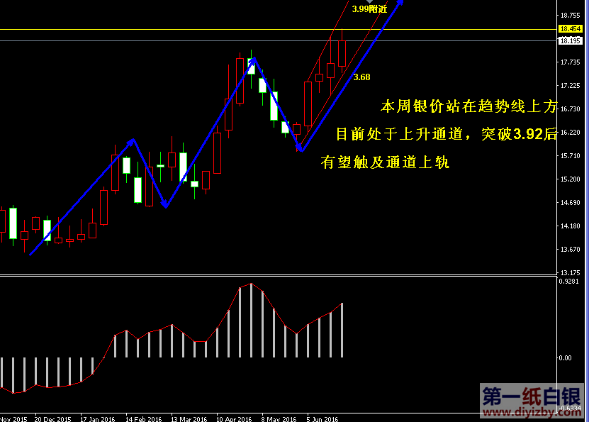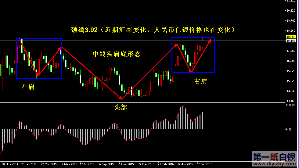 目前紙白銀價格是3.869元/克。昨日紙白銀出現(xiàn)補漲行情,在黃金價格未發(fā)生變動的情況下,銀價一舉拉升觸及中線分水嶺3.92附近,雖最終未能突破,但可預(yù)見后市銀價突破分水嶺的概率極大,目前行情距離3.92前期高點僅差一步之遙,投資者只需耐心持有多單,等待最終走勢完成突破后開始新一輪布局。近期紙白銀走勢波動超出我們預(yù)期(本預(yù)計銀價可能通過幾日的空中加油后才能拉升,但近期避險事件層出不窮,銀價在高位快速獲得了新的買盤動能),仍然如前期建議一樣,無論銀價是在高位空中加油,還是提前突破3.92分水嶺,大趨勢始終看漲,只要不去盲目做空,何時突破對我們并無多大影響,投資者在持有多單的情況下等待區(qū)間破位后順勢跟進即可。如下圖所示為紙白銀周線走勢圖,如圖中紅色箭頭所示,銀價經(jīng)歷了1年半的時間已經(jīng)在低位形成了一個完整的頭肩底形態(tài),其中藍色框所示分別為左肩和右肩,黃線所示為頸線位置,目前該形態(tài)是標(biāo)準(zhǔn)的教科書式的頭肩底,后市銀價一旦突破頸線3.92,將完成中長線底部格局。眾所周知,頭肩底形態(tài)是重要的筑底反轉(zhuǎn)形態(tài)之一,一旦伴隨價格突破頸線,則行情有望依賴此形態(tài)確認趨勢轉(zhuǎn)變。紙白銀從2011年開始經(jīng)歷了4~5年的熊市行情,此次若能突破頸線3.92,有望在技術(shù)形態(tài)上完成“熊轉(zhuǎn)牛”趨勢的確認,屆時也將迎來我們之前所說的——向上打開極大空間的行情。雖然昨日銀價大幅拉升,但仍然未能突破3.92關(guān)鍵點位,因此建議投資者還需保持一定的耐心,持有前期多單暫時觀望,后市在突破3.92后可嘗試首先跟單進場,而后采取分批加倉多單的方式布局。綜合分析,紙白銀目前各個周期都指向良好的多頭趨勢,暫無明顯見頂跡象和信號之前,投資者尚不可盲目做空。誠如我們之前所說,3.6~3.9區(qū)間以輕倉做多為主;突破3.9以順勢加倉多單為主;跌破3.6可嘗試高拋低吸。顯然,目前銀價處于做多和即將加倉多單的區(qū)域波動,一旦突破3.92頸線位置,下一目標(biāo)將很快觸及4元附近。(注: 由于紙白銀價格是國際銀價換算而來,而換算過程中涉及到人民幣對美元匯率的變化,即使在國際銀價不變化的情況下,如果人民幣貶值或升值,也會導(dǎo)致紙白銀價 格出現(xiàn)變動。因此,我們的分析只采用最新的國際銀價對應(yīng)的人民幣白銀價格,如與過去分析價格有出入, 投資者應(yīng)知曉其原因。)