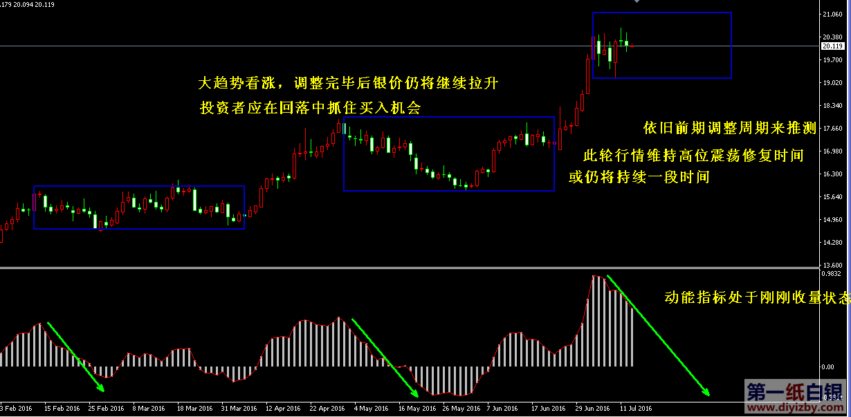 基本面方面:近期隨著英國新首相上任,關(guān)于英國退歐后的局勢開始趨穩(wěn),市場避險情緒逐漸緩解,成為打壓貴金屬下跌的重要因素。另一方面,在日本首相安倍晉三連任成功后,日本內(nèi)閣會議考慮采取10萬億日元的經(jīng)濟(jì)刺激措施,這一舉動令全球貨幣供應(yīng)量再度升高,大量資金轉(zhuǎn)而流入風(fēng)險資產(chǎn)的股市,分流了貴金屬市場的買盤資金。雖然短期內(nèi)市場避險情緒有所回落,不過,近期日本的寬松態(tài)度或?qū)⒃俅我I(lǐng)全球貨幣寬松浪潮,對于中長線貴金屬、股市、風(fēng)險資產(chǎn)均表現(xiàn)利多。昨日公布的美國經(jīng)濟(jì)數(shù)據(jù)小幅上漲,其中美國5月批發(fā)庫存較前月增長0.1%,預(yù)估為增長0.2%,4月上修至增長0.7%,前值為增長0.6%;7月9日當(dāng)周美國連鎖店銷售年率增長0.8%,之前一周為增長0.6%。今日事件較多投資者應(yīng)重點(diǎn)關(guān)注10:30美國克利夫蘭聯(lián)儲主席梅斯特就經(jīng)濟(jì)前景和貨幣政策發(fā)表講話、晚間20:30公布的美國6月貿(mào)易帳、21:00美國達(dá)拉斯聯(lián)儲主席柯普朗就美國和全球經(jīng)濟(jì)發(fā)表講話、22:30公布的美國上周EIA原油庫存變化、明日凌晨00:00美聯(lián)儲發(fā)表經(jīng)濟(jì)狀況褐皮書報告。其中褐皮書報告是投資者關(guān)注重點(diǎn),此次報告或?qū)⒊蔀?月美聯(lián)儲是否加息的關(guān)鍵參考。 技術(shù)僅僅是基于概率論和統(tǒng)計(jì)學(xué)的一種綜合分析手段,絕非預(yù)測。所以技術(shù)分析是在考慮做好止損的情況下去博取大概率事件,投資不可過于迷信技術(shù)分析。(短線操作請一定做好止損,一旦被損,代表分析師基于概率和統(tǒng)計(jì)的技術(shù)分析不適用于當(dāng)前行情) 1、紙白銀短線看點(diǎn)位,中線做方向。 2、以上所有價格為工商銀行買入價,即紙白銀低價。進(jìn)倉點(diǎn)位要再加0.04,出倉則不要。 3、第一紙白銀給出的所有建議僅供投資者參考,不作為下單絕對依據(jù),切勿過于依賴。 4、北京時間09:00發(fā)布此文章。 5、上一交易日白銀價格分析情況:(7月12日)紙白銀缺乏指引 近期震蕩整理或是主旋律