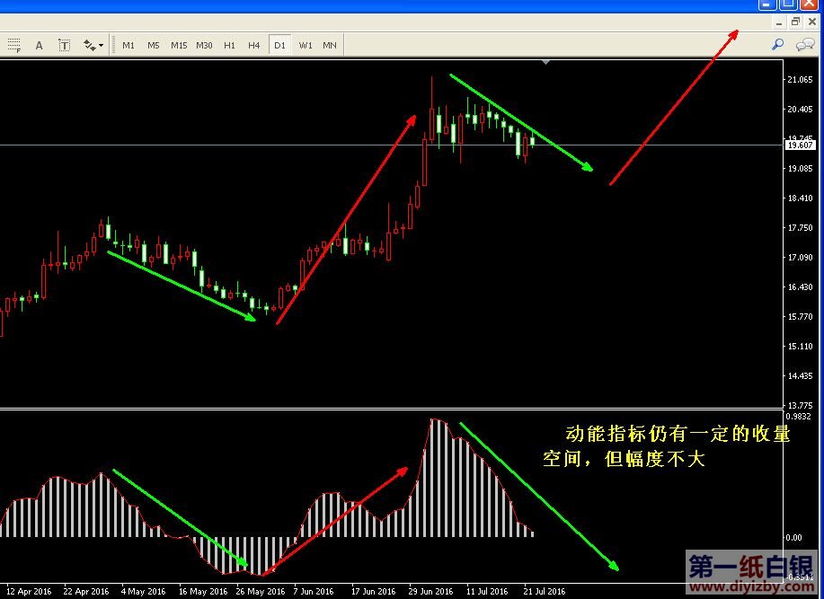 基本面分析:本周市場消息較為清淡,歐洲和日本央行將在更長時間內保持更為寬松政策的前景大大提振貴金屬看漲情緒,不過周內強勁的美國經濟數據加劇了投資者對于未來美聯儲加息預期的擔憂,同時下周四凌晨美聯儲將公布7月最新利率決議,雖然此次決議加息概率不大,但市場由于前期買盤較多,目前紛紛選擇獲利離場觀望,對貴金屬產生一定壓力。專業人士認為美聯儲決策者在7月會議上不太可能加息,同時也并不會暗示下次加息的時機,但料其或肯定美國的經濟增長,預期政策聲明也將反映出美聯儲官員的政策分歧。同時美聯儲也將會在政策聲明中重申前瞻指引,即未來的政策行動取決于經濟數據,并繼續強調通貨膨脹方面的進展情況。但是,經濟數據的好轉不能排除美聯儲會釋放出今年至少加息一次的信號。7月利率決議公布后,很大程度上將利多貴金屬上漲。如果其果真不采取加息,并且不暗示未來加息時間,則對金銀走勢仍將起到較強的支撐作用。下周投資者將重點關注周四凌晨02:00公布的美聯儲利率決議。 下周紙白銀短線交易:技術面暗示下周銀價周內波動范圍縮小在4.08~4.23,并且周線顯示其已經走入盡頭;消息面美聯儲利率決議即將公布,同時此次決議加息可能性并不大,因此決議利多貴金屬概率仍然較大。綜合考量消息面和技術面,我們推測,下周銀價周一至周三行情維持在4.08~4.23內繼續調整的概率較大,周四前后,銀價可能因技術面和消息面雙雙觸底而出現反彈,屆時有較大希望向上突破區間4.08~4.23,并展開新一輪上漲走勢。建議投資者目前如果還沒有開始布局多單,或者布局倉位較輕者,下周初應擇機及時補倉在自身承受的合理水平,而后保持觀望,耐心等待銀價在區間4.08~4.23的突破。此區間內投資者可著重在4.14~4.16、4.08~4.12范圍加倉多單。另外,若前期在高位做空的投資者,下周行情調整中務必及時獲利離場,切勿過分看空。 下周紙白銀中線交易:紙白銀中長線按照原計劃繼續采取分批3~5分的方式布局多單,總倉位控制在8成內即可。正如上圖黃色箭頭所示,目前周線所示的大趨勢維持上漲格局,而綠色箭頭的下跌僅僅是回調走勢,屬于次級趨勢。根據趨勢理論得出,當次級趨勢遇到主趨勢的支撐后,行情有望順應主趨勢發生波動;诖,我們預測未來銀價回調到重要支撐位后,將完成空頭力量的釋放,并積蓄新的買盤動能,屆時有望順應主趨勢向上開始新的拉升。對于新的拉升目標暫時可看至4.75上下。未來銀價更上方的空間也是通過逐步向上打開得到,尚難一步到位看得很多。 下周紙白銀關注重點:美聯儲利率決議、紙白銀技術面。 下周紙白銀多空震蕩預計: 多-空-震蕩=3:3:4 下周紙白銀重要支撐阻力: 阻力:4.23、4.33、4.43附近、4.49附近、4.75。 支撐:4.14~4.16、4.08~4.12、4.04~4.05、3.96、3.86~3.87。 下周提示:根據紙白銀日線來看,銀價下周仍有繼續回調的空間,但動能指標已經靠近零軸附近,下方收量幅度開始縮小,行情在下周可能出現先觸底后反彈的格局。如下圖所示為紙白銀日線走勢圖,參考前期回調形態和動能,我們大致推算下周銀價回調情況,周內行情若是出現較為快速的下跌,可能是空頭力量迅速釋放的情況,一旦伴隨突如其來的強勢反彈,則暗示銀價調整恐結束。下周走勢“弱強”交替改變的可能性較大,重點需關注周四美聯儲決議前后行情是否出現快速下跌后的強勢反彈。