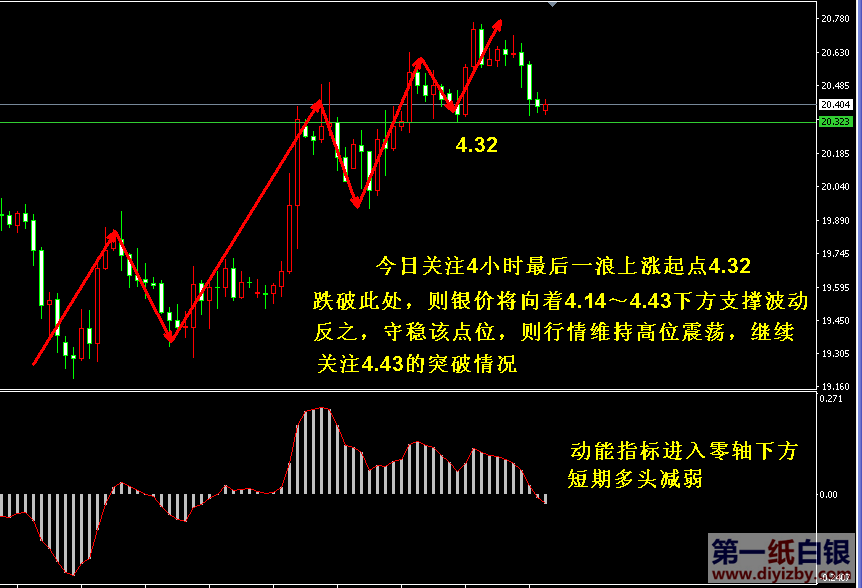 目前紙白銀價格是4.337元/克。昨日紙白銀沖高回落,在近期銀價測試周線阻力4.42~4.43后,行情未能突破該點位,暗示走勢將繼續在周線區間4.14~4.43內波動,直至非農前,該區間或難以突破,建議投資者在回落中繼續分批買入多單,留有一定倉位等待非農數據出爐后操作。如下圖所示為紙白銀4小時周期走勢圖,當前銀價正處于紅色箭頭所示的超短線上漲格局,但近期行情在周線阻力4.42~4.43發生沖高回落,有一定概率改變這種超短線形態。日內建議投資者首先關注4小時上漲走勢的最近一個上漲浪低點4.32,若近期行情跌破此處,則銀價將打破圖中紅色箭頭所示上漲形態,短線走勢有望朝著周線區間4.14~4.43的下方支撐靠攏;反之,若銀價守穩4.32的上漲浪低點,則行情或繼續維持高位震蕩,但預計在非農前難以突破4.43,屆時將由非農數據指引行情方向。另外,值得注意的是,當前超短線動能指標逐漸減弱(圖中動能指標進入零軸下方),暗示短期內買盤力量并不充足,日內走勢難以大幅拉升,關注4.32能否守穩即可判斷今日行情下跌或震蕩。綜合分析,由于周線區間指示銀價本周波動范圍在4.14~4.43之間,因此在非農前行情于此區間波動概率較大,且周二銀價觸及4.42~4.43附近沖高回落,更進一步暗示周線阻力具有一定壓制。今日若銀價再向下跌破4.32超短線上漲浪低點,則周四至周五白天銀價預計會朝著4.14的周線區間低點靠攏。屆時投資者可在回落中分批布局多單。由于大趨勢看漲不變,銀價短線回踩支撐后仍將繼續看漲。(注: 由于紙白銀價格是國際銀價換算而來,而換算過程中涉及到人民幣對美元匯率的變化,即使在國際銀價不變化的情況下,如果人民幣貶值或升值,也會導致紙白銀價 格出現變動。因此,我們的分析只采用最新的國際銀價對應的人民幣白銀價格,如與過去分析價格有出入, 投資者應知曉其原因。)