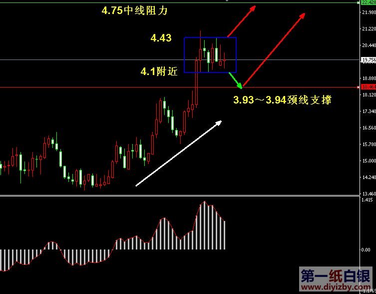 基本面方面:由于近期美國經濟數據表現良好,加劇了投資對于美聯儲年內加息的擔憂,打壓避險情緒下降,使得貴金屬接連出現下跌。不過今日凌晨公布的美聯儲7月會議紀要卻意外釋放鴿派言論,銀價受此消息影響得以觸底反彈。本次會議紀要表達了相對鴿派的觀點,在英國脫歐后,由于擔心就業增速放緩,多數美聯儲官員并不贊成短期內加息,這使得美聯儲在9月加息的概率大大降低。在會議紀要公布之前,市場關于9月加息預期在24%,而會議紀要公布后,9月加息預期驟降至12%,可見市場情緒發生了一定改變,是促使貴金屬得以反彈的重要因素。另外,此次會議紀要還釋放了較為重要的信號:加息路徑將是非常緩慢和謹慎的。因此,未來美國經濟除非很長一段時間表現強勁,美聯儲才可能謹慎的開始加息,否則任何疲軟經濟跡象,都可能阻礙美聯儲加息,這對貴金屬來說將是一個長期利好因素。今日投資者可關注晚間19.30公布的歐洲央行公布貨幣政策會議紀要、20.30公布的美國8月13日當周初請失業金人數、22.00公布的美國7月諮商會領先指標月率。 提醒:以周線走勢來看,近期行情在4.1~4.43的突破也將決定下一目標,但并不改變中長線趨勢。如下圖所示為紙白銀周線走勢圖,圖中藍色框所示為當前行情所處1個半月的震蕩區間4.1~4.43,而綠線所示為中長線下一道強阻力4.75附近;紅線所示為中線頸線支撐3.93~3.94附近。白線所示為大趨勢上漲。由此我們得出:若銀價突破4.43,則短線走勢順應白線趨勢上漲,行情將很快測試4.75上方;若銀價跌破4.1,則短線走勢與白線上漲趨勢逆勢,行情將回踩更低支撐才能企穩,預估在頸線位置的3.93~3.94附近,而后方可順應主趨勢重新上漲。