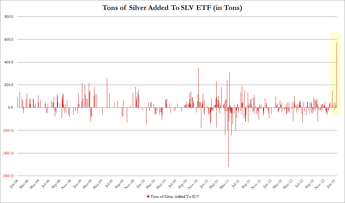 本周四,全球最大白銀ETF SLV一天之內(nèi)持倉增加572噸,規(guī)模超過了2012年全年該ETF的增持量544噸。 ![]()