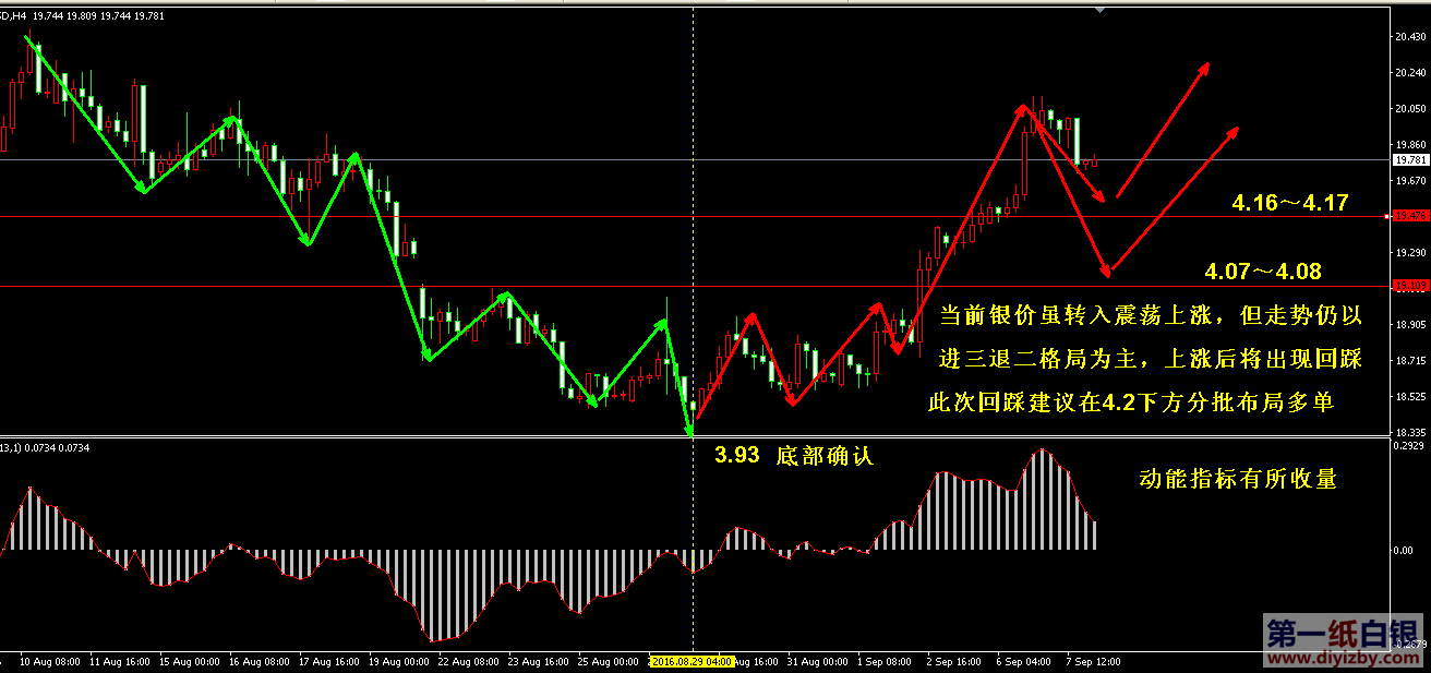 技術(shù)僅僅是基于概率論和統(tǒng)計學(xué)的一種綜合分析手段,絕非預(yù)測。所以技術(shù)分析是在考慮做好止損的情況下去博取大概率事件,投資不可過于迷信技術(shù)分析。(短線操作請一定做好止損,一旦被損,代表分析師基于概率和統(tǒng)計的技術(shù)分析不適用于當前行情) 1、紙白銀短線看點位,中線做方向。 2、以上所有價格為工商銀行買入價,即紙白銀低價。進倉點位要再加0.04,出倉則不要。 3、第一紙白銀給出的所有建議僅供投資者參考,不作為下單絕對依據(jù),切勿過于依賴。 4、北京時間08:56發(fā)布此文章。 5、上一交易日白銀價格分析情況:(9月7日)紙白銀即將考驗密集阻力 獲利多單保持觀望