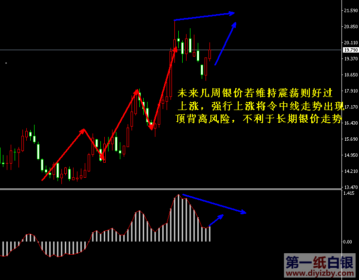基本面方面:昨日晚間美國幾項經(jīng)濟數(shù)據(jù)表現(xiàn)良好,且美聯(lián)儲官員繼續(xù)發(fā)布了升息言論,這打壓了貴金屬市場的避險情緒。具體數(shù)據(jù)顯示,美國7月JOLTS職位空缺587.1萬,打破4月份所創(chuàng)紀錄最高位,預(yù)期563萬,前值564.3萬。另外,舊金山聯(lián)儲主席威廉姆斯威廉姆斯近期表示,他仍然支持加息宜早不宜遲,重申了他在疲軟的8月非農(nóng)就業(yè)數(shù)據(jù)公布之前的言論。不過,今日凌晨美聯(lián)儲公布了較為鴿派的褐皮書報告,其中褐皮書報告顯示美國經(jīng)濟溫和增長支撐了市場對于聯(lián)儲短期內(nèi)不會升息的觀點,褐皮書指出,多數(shù)地區(qū)報告薪資壓力仍相當溫和,預(yù)計未來數(shù)月將保持此狀況;另外,四年多來,通脹一直低于聯(lián)儲2%的目標,在看到通脹持續(xù)上升前,決策者仍對升息感到猶豫。由此可見,目前美聯(lián)儲內(nèi)部仍然對盡快升息產(chǎn)生擔憂,預(yù)計9月美聯(lián)儲難以實現(xiàn)加息。今日市場焦點轉(zhuǎn)移至歐洲央行利率決議,投資者也擔憂近來疲弱的美國數(shù)據(jù)會增加歐洲央行進一步放寬政策的壓力,由此可能會刺激全球新一輪貨幣寬松浪潮,對于貴金屬未來仍然有極大的利多可能性。投資者還需關(guān)注晚間20:30公布的美國9月3日當周初請失業(yè)金人數(shù)、23:00公布的美國9月2日當周EIA原油庫存變動。 提醒:從周線形態(tài)來看,未來幾周銀價并不具備強行快速上漲的條件,因前期下跌動能指標快速放量,此時市場中線買盤力量仍不充足,還需時間積累,若強行拉升,恐破壞中線上漲形態(tài),最終難免出現(xiàn)周線頂背離風(fēng)險。如下圖所示為紙白銀周線走勢圖,圖中藍色箭頭為假設(shè)銀價未來幾周快速上漲所產(chǎn)生的形態(tài),當前行情因剛剛經(jīng)歷了大調(diào)整,不宜快速反彈,否則可能應(yīng)買盤動能不足而過渡消耗能量,最終在突破前高后形成頂背離風(fēng)險。未來幾周銀價若維持震蕩走勢,則好過與快速上漲,震蕩中實際是積累長期多頭的過程,過快上漲將透支已經(jīng)存在的買盤力量,不利于下半年銀價表現(xiàn)。因此,若果真近期行情維持震蕩波動,則投資者應(yīng)具備更多的耐心持倉等待,激進者在回落震蕩中可通過不斷的低吸后反彈獲利來進行短線操作。