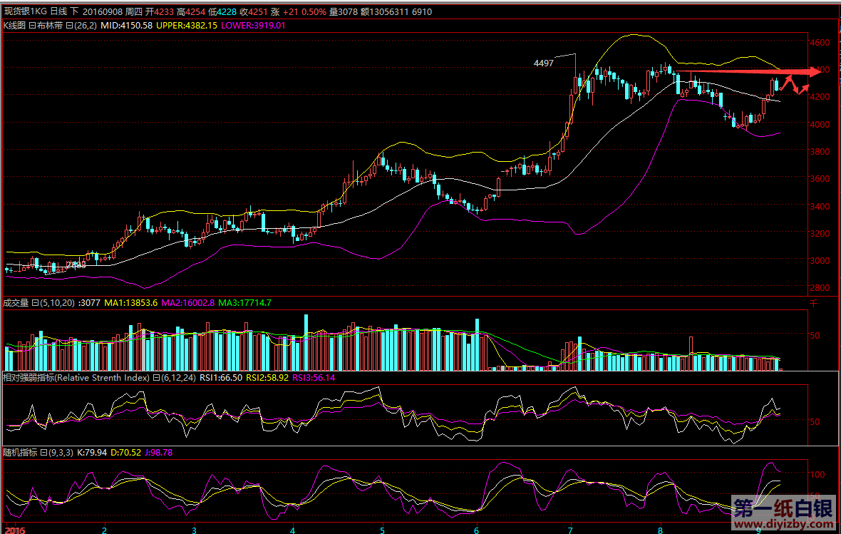 白銀周三(9月7日),開盤價4.29元/G,盤中最高觸及4.32元/G,最低見4.24元/G,最終收盤于4.25元/G,日內跌幅1.32%,日線報收小陰線。在周三行情當中白銀走了震蕩型回撤,但從凌晨來看屬于低位橫盤,日線雖然報收于小陰線回撤到5日均線位置,但從形態上看還是很難走出二次強勢態勢,因此,短線上還是需要注意震蕩。 消息面: 周三,歐股收漲,美股漲跌不一,美油大漲2.8%,突破46關口,因API原油庫存數據意外錄得大幅下降。周三發布的美聯儲褐皮書顯示,7月底到8月底美國國內經濟以溫和速度增長,通脹輕微抬頭;“勞動力市場狀況在大多數地區持續收緊,就業整體呈現適度增長。此外,7月JOLTS空缺職位數刷新最高紀錄,表明就業市場保持良好復蘇勢頭。JOLTS空缺職位數是耶倫最關心的就業指標。盡管8月美國ISM制造業和服務業數據遠遜預期,舊金山聯儲主席Williams和里士滿聯儲主席Lacker先后表態認為加息有理。前者說美國經濟現狀良好,逐漸加息合理且宜早不宜遲;后者說下半年美國經濟會復蘇,9月加息理由會是強有力的。然而,高盛已經打臉。高盛大幅下調美聯儲9月加息概率,從55%降至40%。就在上周五,面對8月低于預期的非農數據,高盛還吶喊“8月非農剛好到達支持9月加息的程度”。 周四(9月8日)亞洲時段,投資者稍加留意日本的二季度GDP和貿易帳,關注澳大利亞的商品和服務貿易帳對澳元的影響,然后投資者重點關注中國貿易帳數據對全球市場風險情緒的影響。歐洲時段,市場經濟數據較為稀少,在歐洲央行決議前,市場交投料較為謹慎。北京時間19點45分投資者密切關注歐洲央行9月利率決議,雖然市場預計本次會議歐洲央行不會進一步增加購債,但市場認為歐洲央行可能會延長購債期限。決議之后,北京時間20點30分,歐洲央行行長德拉基召開新聞發布會,投資者密切關注德拉基在發布會上有關歐元區經濟前景和政策前景的描述,從而判斷政策前景的變化對歐元區金融市場的影響。紐約時段,投資者密切關注美國當周初請失業金數據,在上周非農數據不及預期之后,投資者仍然關心美國就業市場的表現。另外,交易加元的投資者關注加拿大的兩項房市數據。當然,交易原油的投資者還需要密切關注EIA原油庫存數據給油價帶來的影響。 全球最大白銀上市交易基金(ETF)—iSharesSilverTrust統計表示,其截至9月8日止白銀持倉量為11,281.84噸,與前一交易日比增持19.05噸。 技術面: 日線上,昨日收得一根帶上下影線短的小陰,結束連陽,運行在布林帶中軌和上軌之間,布林帶走平運行,MACD附圖指標金叉放量運行,KDJ在80上方形成死叉向下運行,預計有回踩需求,從K線走勢看有上行風險。4小時上,從上軌回落到中軌上方,布林帶向上收口運行,MACD形成死叉放量運行,KDJ向下運行,短期有下行風險,但下方支撐沒有跌破,仍偏強,操作上主要以回踩做多為主,高空為輔! ![]()