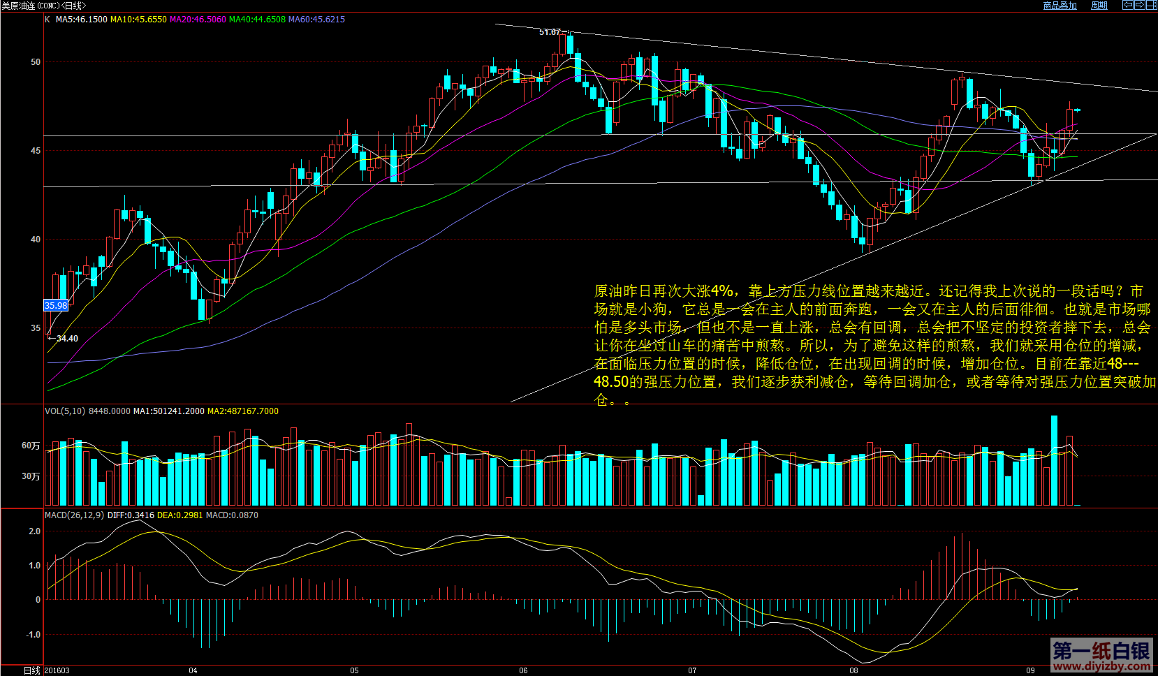 昨日白銀價格再度回調,目前白銀已經連續兩日出現回調行情,完全吞沒了周二的漲幅。目前60日均線價格的19.48和40日均線19.67應該是短期回調的強支撐位置,也是我們建議投資者回落加倉的點位。總之,目前白銀仍然處于多頭為主的市場中,回調是加倉的機會,回調幅度越大,則加倉幅度越大,后市銀價調整完畢后預計仍有繼續上漲的空間,暫時不可應下跌而改變做多方向。 日內策略:可圍繞60日均線19.48附近布局多單,若跌破該點位,則仍可采取分批加倉的方式,整體走勢以上漲為主,但需更多的耐心等待。 再來看看原油走勢,昨日原油價格大漲4%,目前距離上方壓力線位置越來越近。目前原油市場無疑也處于多頭之中,但是任何多頭市場都不可能一直上漲,中途難免出現回調,這種回調是為了回踩更好的蓄力后的上漲。每次回調也會把不堅定的市場投資者洗盤出局,有利于下一次拉升。 目前原油操作同樣采取增加倉位的方式操作,當出局壓力位置時候,降低倉位,在出現回調的時候,增加倉位。目前在靠近48~48.5的強壓力位置,建議逐步獲利減倉,等待回調后重新加倉進場,或者等待突破強壓力位置后追多進場。
