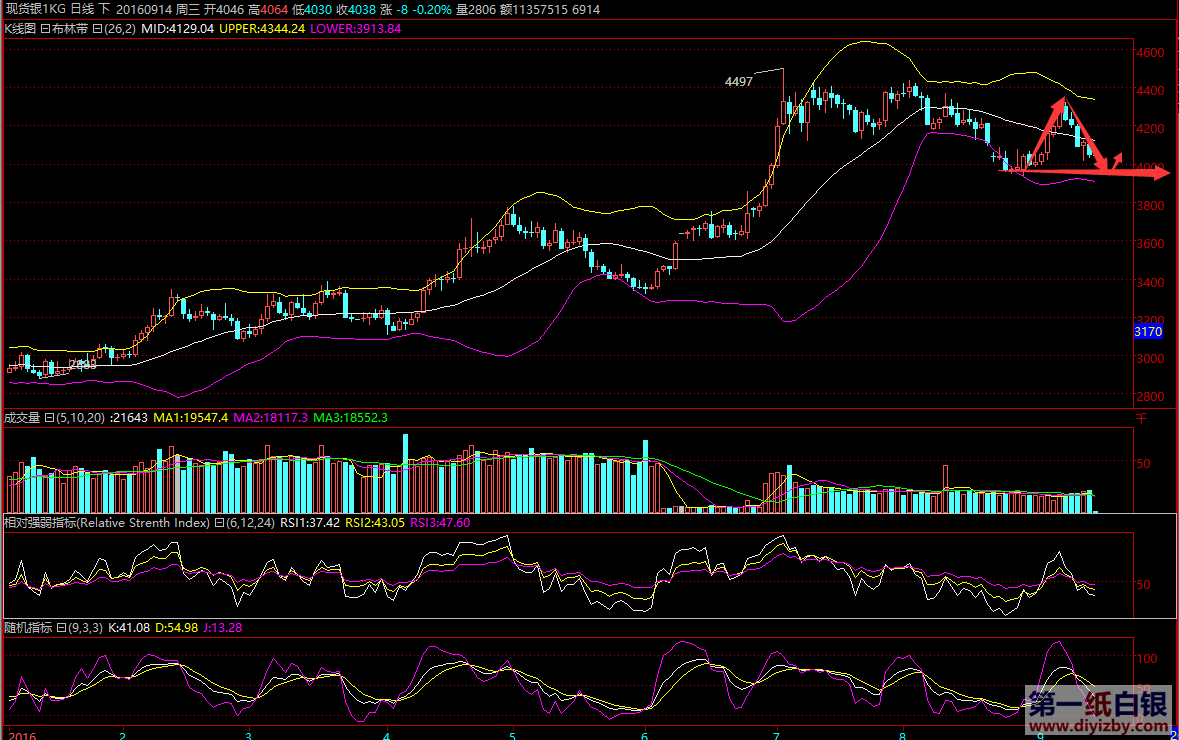 周二(9月13日)白銀走了連續(xù)性回撤,再次回落至周一低點位置且收盤于低點,日線形成陰線,在今日的行情當(dāng)中需要特別注意的是行情經(jīng)歷了沖高回落收低,那么在一定程度上會有所向下延續(xù),也就是說今日的銀幣有望繼續(xù)回落,凌晨連續(xù)性橫盤,按照4小時級別當(dāng)中,上方關(guān)注4.12-4.15一線阻力,關(guān)鍵性位置處于昨日午盤的高點位置,下發(fā)關(guān)注4.02一線支撐,今日繼續(xù)看下行。 消息面: 周一美聯(lián)儲理事布雷納德發(fā)表了偏鴿派的講話后黃金跌勢有所緩解,但金價仍繼續(xù)下跌。有“美聯(lián)儲通訊社”之稱的華爾街日報首席經(jīng)濟記者Jon Hilsenrath日前也撰文稱,美聯(lián)儲并未就9月加息達(dá)成強烈共識,傾向于等到年底再加息。從6月末英國公投之后,黃金就開始了漫長的整理,圖形顯示1302-1358黃金寬幅的區(qū)間震蕩,而市場焦點仍然是美聯(lián)儲加息預(yù)期,以及其他主要央行行動方向。英國央行(BoE)將于周四(9月15日)發(fā)布利率決議;日本央行將于9月21日公布最新的利率決議。在這些重大決定發(fā)布之前,市場觀望氣氛濃重,不過有機構(gòu)仍認(rèn)為支撐黃金上漲的基本面不變,金價下一步還將繼續(xù)上行,目前不過是尋底階段。 周三(9月14日)亞洲時段,投資者稍加留意澳大利亞的經(jīng)濟數(shù)據(jù),關(guān)注日本的工業(yè)產(chǎn)出數(shù)據(jù),當(dāng)然重點還是要關(guān)注中國市場的走向。歐洲時段,歐元區(qū)方面,投資者先是留意法國的CPI數(shù)據(jù),然后重點關(guān)注歐元區(qū)的工業(yè)產(chǎn)出數(shù)據(jù),預(yù)計該數(shù)據(jù)會指引歐元短線走勢的方向。英國方面,投資者重點關(guān)注英國失業(yè)率數(shù)據(jù),在周二英國公布的不及預(yù)期的通脹數(shù)據(jù)重挫英鎊之后,英國的就業(yè)數(shù)據(jù)是否也會不及預(yù)期呢?投資者拭目以待。另外,時段內(nèi)中國還會公布實際外商投資數(shù)據(jù),投資者也要密切關(guān)注。紐約時段,美國數(shù)據(jù)方面,投資者主要關(guān)注美國的進口物價指數(shù)。 全球最大白銀上市交易基金(ETF)—iSharesSilverTrust統(tǒng)計表示,其截至9月14日止白銀持倉量為11,272.98噸,與前一交易日比增持41.34噸。 技術(shù)面: 日線上,收得一根帶下影線長的小陰,收在布林帶中軌下方,布林帶上中軌向下運行,下軌走平運行,MACD附圖指標(biāo)形成死叉運行,KDJ向下運行,接觸20一線,預(yù)計有回踩需求,從K線走勢高點低點不斷下移,仍然偏弱,有下行風(fēng)險。4小時上,承壓布林帶中軌下方,布林帶向下運行,MACD附圖指標(biāo)死叉運行,KDJ向下運行接觸20一線,有下行風(fēng)險,操作上暫時以反彈做空為主,低多為輔!