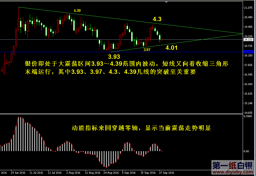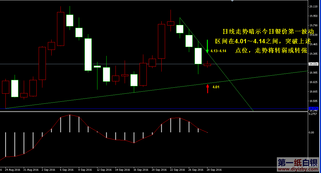 技術僅僅是基于概率論和統計學的一種綜合分析手段,絕非預測。所以技術分析是在考慮做好止損的情況下去博取大概率事件,投資不可過于迷信技術分析。(短線操作請一定做好止損,一旦被損,代表分析師基于概率和統計的技術分析不適用于當前行情) 1、紙白銀短線看點位,中線做方向。 2、以上所有價格為工商銀行買入價,即紙白銀低價。進倉點位要再加0.04,出倉則不要。 3、第一紙白銀給出的所有建議僅供投資者參考,不作為下單絕對依據,切勿過于依賴。 4、北京時間08:59發布此文章。 5、上一交易日白銀價格分析情況:(9月27日)紙白銀沖高阻力失敗 短線將回踩支撐蓄能