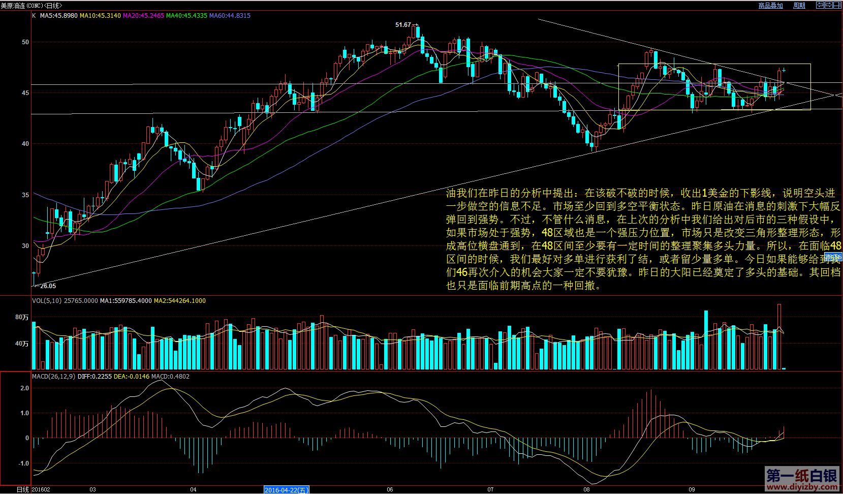 18.5~19美元之間成為白銀價格的強支撐區域,最近兩個交易日銀價都在19區域附近得到支撐,昨日行情以長下影線收盤,暗示銀價有企穩跡象。但從黃金日K線走勢來看,行情似乎有下破的可能性,一旦多頭放棄,金價將跌破震蕩區間向下回踩1250支撐。如果是這種情況,白銀屆時恐也面臨回落風險。不過,值得慶幸的是,黃金即使跌至1250附近,其上漲趨勢也未改變,只是一輪中線回調。 因此,近期白銀多單建議嚴格止損在18.5下方,跌破此處務必離場,短線可能再度下行。保守者以19美元下方為止損亦可。 近期多單暫看60日均線阻力19.6附近,第二獲利目標看20美元整數關口。 再來看看原油走勢,昨日我們強調原油價格回歸到了多空平衡的狀態,昨日原油在消息面刺激下大幅反彈到強勢區域。不過正如下圖黃色框所示,當前油價的48區域是一個強壓力位置,市場昨日的突破只是改變三角形整理形態,形成高位橫盤通道,在48區域至少有一定時間整理聚集多頭力量。所以,在面臨48區間壓力是很,我們建議多單離場觀望,或者持有少量多單。 今日油價若能再次回踩46附近可以介入多單,昨日上漲奠定了多頭基礎,回踩僅僅是因為48壓力而出現的回撤,完全可以做多。