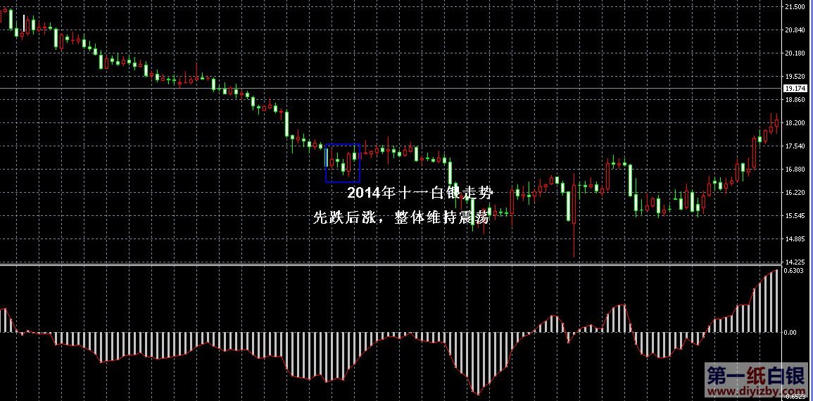 2013年十一期間白銀走勢:此時白銀價格仍然處于熊市階段,且短線亦處于下跌格局之中,不過十一假期期間,銀價迎來了反彈修正,觸底反彈后幅度超過2美金,整體走勢維持上漲,而后過了十一假期才延續(xù)跌勢。