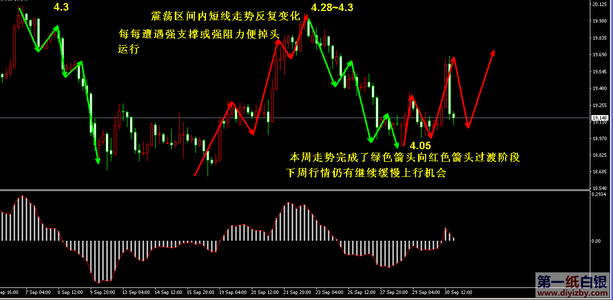 目前紙白銀價(jià)格是4.095元/克。本周紙白銀延續(xù)了沖高后的調(diào)整,不過銀價(jià)在周五出現(xiàn)極大反彈,最終因高位空頭壓力較大,行情在周五又再次沖高回落,日線收盤長上影線的小陽線。從走勢(shì)形態(tài)來看,本周超短線銀價(jià)在突破強(qiáng)弱分水嶺4.14后結(jié)束了短線下跌的調(diào)整,下周行情有望繼續(xù)緩慢上行。如下圖所示為紙白銀4小時(shí)周期走勢(shì)圖,從圖中紅綠箭頭的轉(zhuǎn)換可看出,當(dāng)前銀價(jià)仍然處于區(qū)間內(nèi)來回震蕩,尚未擺脫大區(qū)間3.93~4.39的包圍,后市投資者需密切關(guān)注該區(qū)間突破后順勢(shì)跟進(jìn)。本周銀價(jià)在回踩4.05后完成了超短線趨勢(shì)的改變,綠色下跌箭頭所示的回落最終被打破,雖周五銀價(jià)出現(xiàn)較大下跌,但短線走勢(shì)顯示其仍然維持震蕩緩慢上行格局,下周走勢(shì)在回踩完畢支撐后仍有繼續(xù)反彈的機(jī)會(huì)。不過,因下周將迎來美國非農(nóng)數(shù)據(jù),在非農(nóng)公布之前,市場(chǎng)情緒或較為謹(jǐn)慎,加之本周銀價(jià)沖高顯示空頭壓力極大,下周行情反彈力度和幅度或較弱,投資者在低位布局多單后需耐心持有。綜合分析,前期銀價(jià)在沖擊前浪高點(diǎn)4.3后出現(xiàn)一輪回落,本周回落至密集支撐帶4.05附近形成反彈,而根據(jù)形成的反彈形態(tài),銀價(jià)又構(gòu)筑出了短線震蕩上行走勢(shì),下周行情預(yù)計(jì)將圍繞該形態(tài)緩慢拉升,當(dāng)其再度測(cè)試4.3附近后,投資者需關(guān)注銀價(jià)是否突破。正如我們之前所說,未來銀價(jià)突破4.3和4.39后將完成日線趨勢(shì)由“震蕩--上漲”的轉(zhuǎn)變,同時(shí)突破大震蕩區(qū)間高點(diǎn)4.39后激活市場(chǎng)潛在多頭力量。以上建議僅供參考, 不作為下單依據(jù)。