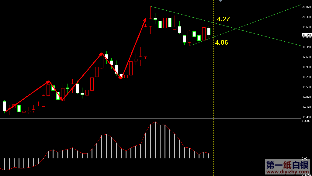 基本面分析:自美聯(lián)儲(chǔ)宣布9月不加息后,市場(chǎng)對(duì)于12月加息預(yù)期有所增加,本周公布的一系列美國經(jīng)濟(jì)數(shù)據(jù)均表現(xiàn)良好,其中包括了消費(fèi)信心、GDP、耐用品訂單以及勞動(dòng)力市場(chǎng)數(shù)據(jù)都顯示強(qiáng)勁,這為美聯(lián)儲(chǔ)12月加息進(jìn)一步助力,打壓周內(nèi)銀價(jià)始終處于低位。不過,考慮到未來全球諸多不確定性,如意大利退歐風(fēng)險(xiǎn)、美國總統(tǒng)選舉、歐洲銀行業(yè)危機(jī)等,市場(chǎng)避險(xiǎn)情緒卻遲遲難以消退,貴金屬在低位后又遭遇強(qiáng)烈買盤,最終本周金銀走勢(shì)維持了多空膠著的局面。下周中國市場(chǎng)將因國慶節(jié)假期而休市,但歐美市場(chǎng)仍然正常運(yùn)轉(zhuǎn),且將迎來一些列重大消息,仍然建議投資者密切關(guān)注。下周建議投資者重點(diǎn)關(guān)注美國副總統(tǒng)辯論和周五的非農(nóng)就業(yè)數(shù)據(jù)。下周五(10月7日)美國勞工部將公布美國9月非農(nóng)就業(yè)報(bào)告,考慮到8月非農(nóng)就業(yè)人數(shù)疲軟,9月數(shù)據(jù)需足夠樂觀才能證實(shí)美國勞動(dòng)力市場(chǎng)強(qiáng)勁。若數(shù)據(jù)表現(xiàn)一般,則仍將打壓投資者對(duì)于美聯(lián)儲(chǔ)加息預(yù)期,支撐避險(xiǎn)情緒回歸。 下周紙白銀短線交易:短線形態(tài)正如上圖所示,雖然經(jīng)歷了周五沖高回落,但走勢(shì)已經(jīng)由綠色下跌轉(zhuǎn)入紅色上漲,但上漲幅度較為緩慢,建議下周投資者可繼續(xù)持有多單看漲。輕倉或空倉者周初可在4.1下方分批加倉多單,建議保守者止損4元下方,激進(jìn)者可止損大震蕩區(qū)間3.93下方。此輪上漲將再度看至4.3前浪高點(diǎn)的沖擊,若突破此處,則銀價(jià)日線完成趨勢(shì)改變,后市走勢(shì)有望醞釀一輪中線上漲。另外,投資者密切關(guān)注本周低點(diǎn)4.05是否守穩(wěn),若跌破該點(diǎn)位,則下周走勢(shì)將走入弱勢(shì),恐在非農(nóng)之前保持震蕩,直至非農(nóng)后順應(yīng)消息波動(dòng);守穩(wěn)4.05的情況下方,非農(nóng)前銀價(jià)有望緩慢震蕩上行。 下周紙白銀中線交易:下周市場(chǎng)將迎來非農(nóng)數(shù)據(jù),若經(jīng)過非農(nóng)刺激后,銀價(jià)能突破大區(qū)間3.93~4.39,則經(jīng)歷了近三個(gè)月的調(diào)整將宣告結(jié)束,屆時(shí)中長線將有望迎來新一輪波動(dòng)。若銀價(jià)不幸跌破3.93,則并不改變中線走勢(shì),行情將繼續(xù)向下尋求更強(qiáng)支撐,而后才能企穩(wěn)筑底,這將再度經(jīng)歷較長時(shí)間的調(diào)整,中線投資者可通過高拋低吸的方式拉低中長線持倉均;若突破4.3和4.39,則銀價(jià)將完成日線趨勢(shì)“震蕩--上漲”的改變,由于中長線趨勢(shì)始終看漲,當(dāng)二者趨勢(shì)統(tǒng)一后,走勢(shì)將開啟新一輪中線拉升,下一目標(biāo)首先看至年度高點(diǎn)的4.52,接下來可看至4.75上方。 下周紙白銀關(guān)注重點(diǎn):美國副總統(tǒng)辯論、美國非農(nóng)數(shù)據(jù)、紙白銀技術(shù)面。 下周紙白銀多空震蕩預(yù)計(jì): 多-空-震蕩=4:2:4 下周紙白銀重要支撐阻力: 阻力:4.23、4.27~4.3、4.34~4.35、4.39、4.45、4.5~4.52附近。 支撐:4.05、4.01、3.97、3.93~3.94。 下周提示:從周線走勢(shì)來看,本周銀價(jià)的波動(dòng)并未改變當(dāng)前收縮三角形形態(tài),且銀價(jià)下周仍將首先考驗(yàn)收縮三角形的包圍。如下圖所示為紙白銀周線走勢(shì)圖,連接近幾周高點(diǎn)和低點(diǎn)得出的兩條線,構(gòu)成了當(dāng)前周線的收縮三角形形態(tài),數(shù)周以來,銀價(jià)均處于該區(qū)間內(nèi)波動(dòng),且波幅越來越小,下周該收縮三角形范圍在4.06~4.27之間,投資者可靠近邊緣嘗試低吸或減倉。直至上述區(qū)間突破后,暗示多空其中一方力量轉(zhuǎn)強(qiáng),屆時(shí)可大幅跟單進(jìn)場(chǎng)。另外,周線趨勢(shì)正如圖中紅色箭頭所示,維持上漲形態(tài),因此此次調(diào)整后銀價(jià)向上突破三角形收縮區(qū)間的概率較大,建議投資者以低吸為主,切勿盲目做空,遇阻后減倉多單即可。