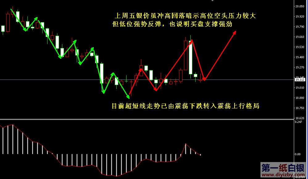 目前紙白銀價格是4.089元/克。上周五紙白銀上演過山車行情,首先是快速拉升至4.2附近,而后因高位受阻又快速沖高回落,日線收盤長上影線的小陽線,顯示當前上方空頭壓力依舊較大,短期內走勢恐繼續維持大區間內震蕩。不過,考慮到銀價目前處于區間低位上方運行,且超短線形態有震蕩上行跡象,建議投資者繼續持有多單,后市將分別看至4.23、4.27~4.3兩線阻力。如下圖所示為紙白銀4小時周期走勢圖,上周五銀價雖沖高回落暗示高位空頭壓力較大,但同樣強勢反彈也證明了低位的買盤較為強勁。以圖中紅綠箭頭的轉換可知,超短線形態目前已逐漸由震蕩下跌轉入震蕩上行之中,后市銀價將有望依靠此形態逐漸震蕩上行。不過值得注意的是,目前的震蕩上行走勢僅僅限于超短線行情,在其未突破4.3和4.39之前,其大趨勢日線走勢仍然處于震蕩范圍內波動。僅當日線趨勢轉入上漲后,其將跟隨中長線上漲趨勢重新開啟新一輪較大幅度的拉升。因此,投資者仍需密切關注此輪銀價觸及大區間阻力4.23、4.27~4.3、4.39幾線的突破情況。綜合分析,由于銀價處于大區間內震蕩,投資者本應在區間內高拋低吸,但考慮到中線趨勢處于上漲,根據趨勢理論,短期走勢將有望順應中期走勢發生變化,因此操作上建議投資者以逢低做多為主,耐心等待未來行情突破區間后指引方向。本周五市場將迎來非農數據,由于9月美聯儲未能加息,且暗示12月加息將根據美國經濟狀況決定,市場關于12月加息預期仍然較高。此次的非農數據若表現良好,可能增加這一預期抬升,打壓貴金屬下行;反之,若非農表現疲軟,將降低12月加息可能性,進而支撐貴金屬繼續反彈。在非農數據公布之前,投資市場或繼續保持謹慎態度,其波動幅度或許并不大。(注: 由于紙白銀價格是國際銀價換算而來,而換算過程中涉及到人民幣對美元匯率的變化,即使在國際銀價不變化的情況下,如果人民幣貶值或升值,也會導致紙白銀價 格出現變動。因此,我們的分析只采用最新的國際銀價對應的人民幣白銀價格,如與過去分析價格有出入, 投資者應知曉其原因。)