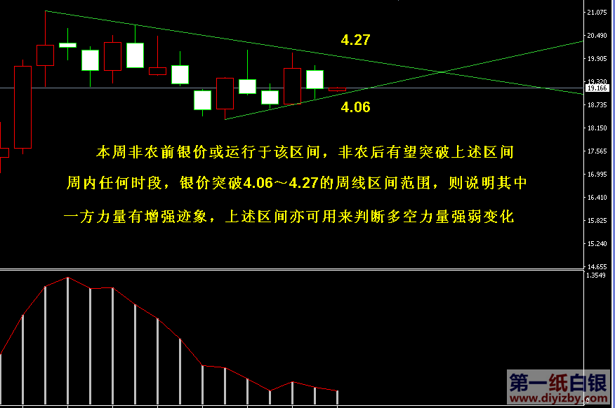 基本面方面:從美聯儲主席耶倫上周的講話可看出,其本人由于擔心經濟過熱,并不希望加息速度增快,而是通過逐步緩慢的加息,使得經濟復蘇進入正常化,而加息路徑并沒有固定的時間表,這也將繼續考量后市美國經濟復蘇狀況;上周的美國大選收場電視辯論吸引了市場的極大關注,不過最終結果以希拉里稍占上風結束,最終打壓了市場避險情緒的回落。美國經濟數據上周表現強勁,但OPEC意外達成凍產協議,令大宗商品出現大幅上漲。另一方面,周內后半段時間,德銀突然爆發危機,大量基金客戶將其業務轉移至其他銀行,令投資者對于德銀的健康狀況越發擔憂。德意志銀行可能成為金融危機期間倒下的另一個雷曼兄弟,此事件也令市場恐慌情緒驟升。本周市場雖然中國仍然休市,但美國將公布最新的非農數據,此次數據也被市場認為影響力較大,建議投資者密切關注。另外,上周的德銀危機進展如何將繼續牽動市場情緒。今日市場消息清淡,建議投資者可關注晚間22:00公布的美國9月ISM制造業采購經理人指數。 提醒:本周初仍然要先了解下周線的波動區間,這將成我我們本周判斷行情可能波動范圍以及強弱情況的標準。如下圖所示為紙白銀周線走勢圖,我們以綠線連接近期銀價的高度和低點,可得出一條支撐線和一條阻力線,其構成了當前銀價所運行的收縮三角形區間。本周該三角形區間范圍在4.06~4.27之間,若市場無消息刺激,銀價很有可能繼續于區間內震蕩。然而周五的非農數據恐令多空力量迅速爆發,最終刺激銀價突破上述區間。建議投資者密切關注本周區間4.06~4.27的突破,本周任何時段,上述區間被突破,則說明市場其中一方力量轉強,則有望激活更多順勢盤進場,進而推進行情進一步波動。周初投資者可在區間兩端操作,建議先低吸,后減倉獲利,臨近周五則持有少量多單保持觀望。