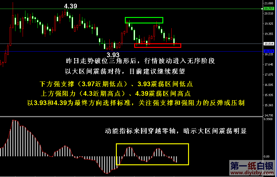 目前紙白銀價格是4.023元/克。昨日紙白銀大幅收陰,周初銀價便跌破了收縮三角形下沿,雖未能說明走勢已經轉跌,但疲軟的多頭力量暗示行情仍然處于弱勢。接下來投資者將繼續關注大區間3.93、3.97、4.3、4.39四大關鍵點位,其中3.93和4.39為震蕩區間低點和高點,突破后將決定銀價接下來短線走勢方向,而3.97和4.3分別為近期行情回踩和反彈的低點和高點,具備一定買盤和賣盤力量,此處投資者需關注銀價的反彈和回落力度。如下圖所示為紙白銀日線走勢圖,由于銀價跌破收縮三角形的緣故,我們再次回歸到用震蕩區間判斷走勢方向的格局。不得不承認,近期的多頭力量較為疲軟,投資者應更加謹慎的加倉多單,僅僅持有部分多單保持觀望,嚴格止損3.93區間低點下方。圖中紅色框和綠色框分別為近期銀價回落的低點支撐位3.97和高點阻力位4.3,昨日走勢在回踩了3.97附近后又再度停止下跌,今日建議投資者首先關注此處反彈,若跌破后則關注3.93震蕩區間能否守穩,依次跌破上述點位后,說明行情將進一步下跌調整,屆時操作思路轉變為先高拋為主,等待企穩后再嘗試低吸;反之,若銀價守住3.93區間低點,并能在3.97附近形成較大反彈,則依舊以區間震蕩行情對待,下一次走勢反彈遇阻后減倉多單離場,直至最終區間突破后可大幅加倉。另外,近期日線動能指標正來回穿越零軸附近,也充分說明了行情處于震蕩走勢之中,在銀價未跌破3.93之前,投資者亦不可盲目做空。綜合分析,昨日的下跌暗示市場多頭力量疲軟,今日考驗支撐后能否守穩十分關鍵,一旦跌破3.93,則說明走勢為期3個月的震蕩調整結束,震蕩后行情仍將繼續下跌回踩支撐,屆時銀價或將逐漸測試中線支撐3.65附近,此種情況下建議投資者在跌破3.93后先反彈高拋,等待企穩后方可低吸;日內銀價若能頂住壓力守穩3.93,則投資者亦須關注其反彈力度,由于多頭疲軟缺乏買盤支撐,建議投資者輕倉持有多單即可。(注: 由于紙白銀價格是國際銀價換算而來,而換算過程中涉及到人民幣對美元匯率的變化,即使在國際銀價不變化的情況下,如果人民幣貶值或升值,也會導致紙白銀價 格出現變動。因此,我們的分析只采用最新的國際銀價對應的人民幣白銀價格,如與過去分析價格有出入, 投資者應知曉其原因。)