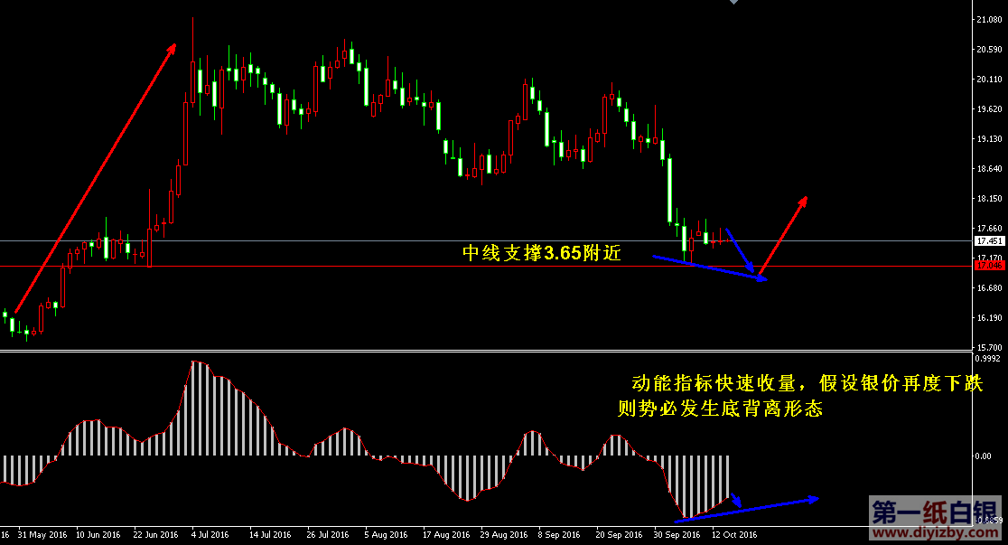 目前紙白銀價格是3.760元/克。昨日紙白銀再度收盤十字星,本周銀價始終維持窄幅波動,不僅處于小區間3.65~3.85范圍內運行,更是每日波幅極窄。不過,值得慶幸的是,雖然目前紙白銀在價格上未見到明顯變化,但是動能上已經顯示出空頭力量逐漸減弱,多頭動能正逐漸增強的跡象,后市行情再度大幅下跌的可能性較低。如下圖所示為紙白銀日線走勢圖,近期行情表現最明顯的莫過于動能指標的持續收量,我們假設了銀價繼續向下回落的可能性(必須先回落靠近或跌破3.65),則在其跌破3.65瞬間后,將發生底背離形態(圖中藍色箭頭所示)。眾所周知,底背離形態是眾多行情反轉的特征之一,其暗示價格創出新低后,賣盤動能未能創出新低,說明下跌動能的衰竭,此時銀價若恰恰處于支撐位,則容易引發多頭反撲,最終完成反轉形態。而此時的走勢恰恰如此,銀價正處于中長線支撐3.65附近波動,當底背離形態發生后,其有望順應圖中紅色箭頭所示的主趨勢發生改變。因此,近期行情若再度下跌,則對于多頭來說將是較大的利好,在其釋放完畢空頭力量后,多頭將較快出現復蘇;反之,若近期銀價未通過先跌后漲的方式完成筑底,則投資者需耐心等待其緩慢震蕩上行突破3.82~3.85的第一阻力帶后方可初步驗證企穩跡象。綜合分析,紙白銀經歷了上周暴跌后,本周基本維持了一周的窄幅橫盤整理,我們可以將此種情況視為銀價多空力量的過渡階段,隨著動能指標持續收量,后市多頭反撲機會越來越大。近期投資者仍然密切關注銀價的兩種情況,其一是先跌后漲底背離形態后反轉,其二則是緩慢震蕩上行突破3.82~3.85阻力。兩種情況都暗示多頭轉強,但第一種形式下,銀價將直接完成筑底。(注: 由于紙白銀價格是國際銀價換算而來,而換算過程中涉及到人民幣對美元匯率的變化,即使在國際銀價不變化的情況下,如果人民幣貶值或升值,也會導致紙白銀價 格出現變動。因此,我們的分析只采用最新的國際銀價對應的人民幣白銀價格,如與過去分析價格有出入, 投資者應知曉其原因。)