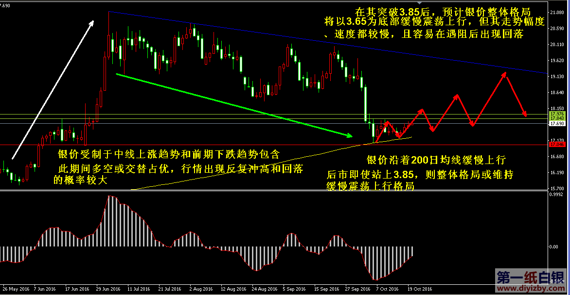 技術僅僅是基于概率論和統計學的一種綜合分析手段,絕非預測。所以技術分析是在考慮做好止損的情況下去博取大概率事件,投資不可過于迷信技術分析。(短線操作請一定做好止損,一旦被損,代表分析師基于概率和統計的技術分析不適用于當前行情) 1、紙白銀短線看點位,中線做方向。 2、以上所有價格為工商銀行買入價,即紙白銀低價。進倉點位要再加0.04,出倉則不要。 3、第一紙白銀給出的所有建議僅供投資者參考,不作為下單絕對依據,切勿過于依賴。 4、北京時間09:03發布此文章。 5、上一交易日白銀價格分析情況:(10月19日)紙白銀緩慢震蕩上行 關注其再次沖擊阻力