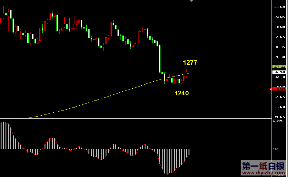 基本面方面:周四凌晨公布的美聯儲褐皮書報告表現平平,其僅聲稱了美國經濟呈現溫和增長趨勢,并未對加息產生進一步指引,數據公布后,美聯儲加息概率維持在64.8%左右,與前期的65%基本持平。昨日晚間公布的幾項美國經濟數據均表現疲軟,支撐了金銀油價格的反彈。具體數據顯示,美國9月新屋開工(年化月率)下跌9.0%;前值為-5.8%,預期為2.5%,9月新屋開工總數錄得2015年3月以來紀錄低位;美國9月營建許可總數為122.5萬戶,比前值114.2萬戶有所降低;美國9月新屋開工總數年化為104.7萬戶,比8月的114.2萬戶有所降低。另外,昨日公布的EIA原油庫存意外大降利好原油價格反彈,EIA公布,截至10月14日該周,美國原油庫存減少530萬桶,上周美國原油日進口量減少91.2萬桶,至647萬桶,為2015年11月來最低。該數據支撐了油價繼續反彈,向著前期高點附近再度發起沖擊,同時支撐了同樣是大宗商品的黃金、白銀價格上行。今日市場將公布諸多數據和事件,預計對行情產生較大影響,建議投資者重點關注晚間19:45公布的歐洲央行利率決議、20:30美國上周季調后初請失業金人數、歐洲央行行長德拉基講話、22:00美國9月NAR季調后成屋銷售。 提醒:近期金價走勢較白銀強勢,投資者亦可多關注黃金突破情況,若其首先向上突破阻力,則暗示銀價后期突破概率極大,屆時可配合金價突破情況嘗試操作白銀。如下圖所示為黃金價格日線走勢圖,近期金價雖然處于中線支撐1240上方波動,但其始終未能收復200日均線,昨日的一輪大漲令其站上200日均線,多頭動能恢復速度較白銀強勢。目前其距離第一阻力1277僅差一步之遙,若其首先實現突破,則后市有望迎來連漲行情,屆時白銀亦將跟隨的概率較大,后市黃金亦可同樣確認1240為底部的事實。