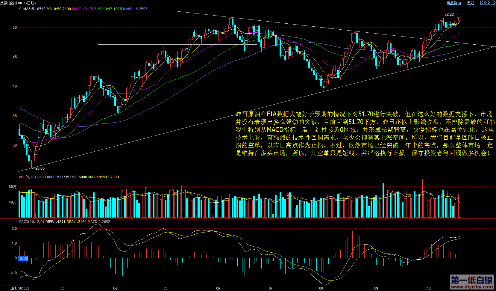 白銀價格在10月以來始終維持在較小的區間內波動,周二周三都是低開高走,但波動幅度較小,且兩個交易日均出現上影線收盤,顯示多頭信心仍然不足。目前17.8美元對于銀價產生較大壓力,不過仍然可以看到銀價的低點正不斷抬高,形成上升三角形整理形態,且MACD動能指標綠柱逐漸收窄,即將轉入強勢區域。 從目前走勢來看,行情對多頭略微有利,多單建議繼續持有。不過,由于目前波動幅度及區間較小,盤面上并沒有體現多頭強勢。所以,一旦回調跌破5日和10日均線的17.5美元,多單應注意止損。 日內策略:繼續持有多單,建議止損放小至5日和10日均線交匯處的17.5下方。 再來看看原油走勢,昨日原油價格在EIA數據大幅好于預期的情況下對51.7進行沖擊,但在如此好數據支持下,油價并沒有實現突破,目前回到51.7下方運行。昨日收盤仍然以上影線收盤,不排除虛破的可能性。 我們特別從原油的MACD指標上看,紅柱接近0軸區域,并形成長期背離,快慢指標也在高位鈍化,這從技術上看有強烈的回調需求,至少會抑制其上漲空間。所以,我們目前拿回昨日被止損的空單,以昨日高點作為止損。不過,既然市場已經突破一年半高點,那么整體走勢仍然維持多頭格局。所以,其空單也只是短線,并嚴格止損,保守者可以等待會做多的機會。 原油日內策略:在51.7下方輕倉做恐,嚴格止損昨日高點上方,目標初看50,破位49.3可持有,否則于此處到達之前全部離場。穩健者可等待回落后重新做多。
