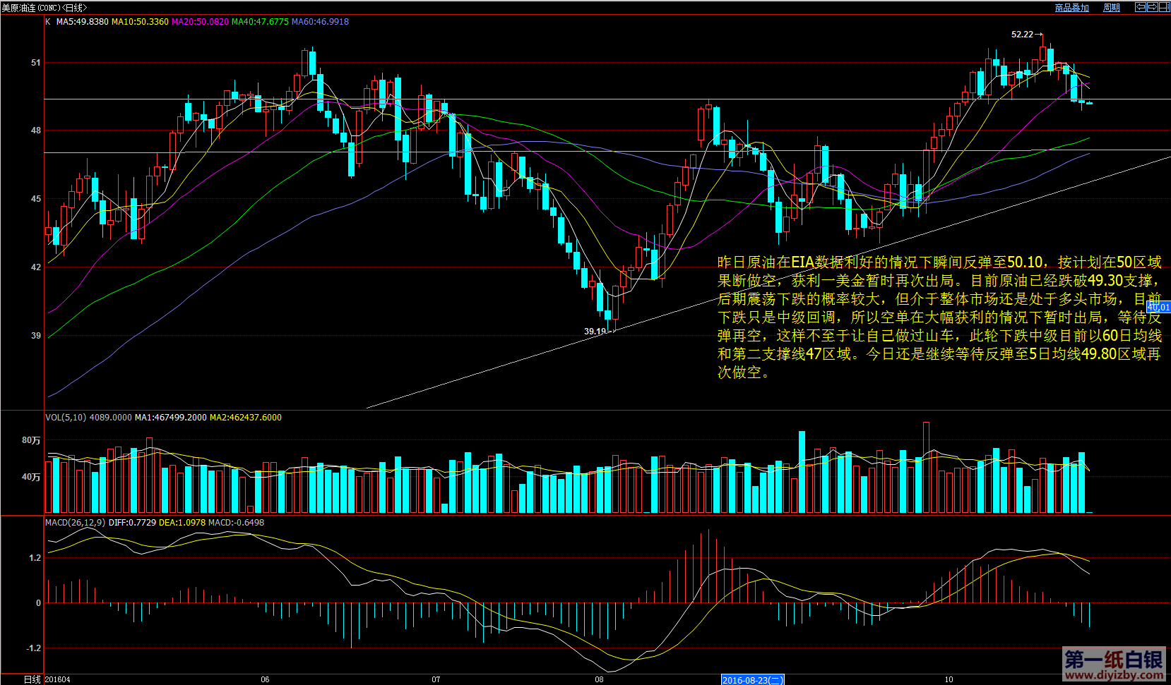 最近一個月白銀價格的走勢都很清淡,始終處于小區(qū)間范圍內(nèi)波動。不過,正如圖中所示,方框內(nèi)的支撐位置仍然有效,且低點在逐步的太高。從整體趨勢上仍然處于多頭市場,從技術指標來看,動能指標處于緩慢放量之中,行情也有反彈需求。 目前為止做多比做空風險要小,不過,建議多單仍然做好嚴格止損,防止意外破位。 日內(nèi)策略:激進者可在盤整區(qū)間內(nèi)輕倉做多,嚴格止損17下方,目標等待破位區(qū)間后放大。 再來看看原油走勢,昨日原油在EIA數(shù)據(jù)利好的情況下瞬間反彈至50.1,投資者按原計劃在50上方進場空單。目前原油已經(jīng)跌破了49.3的支撐位,后期繼續(xù)震蕩下跌的概率較大。 介于整體市場還是處于多頭市場之中,目前下跌僅僅是中級調整,所以空單在大幅獲利情況建議暫時離場觀望,等待反彈再次做空。此輪下跌的終極目標看至60日均線附近和第二支撐47區(qū)域, 今日建議反彈49.8附近做空,止損放大昨日高點50.1上方,目標看47附近。