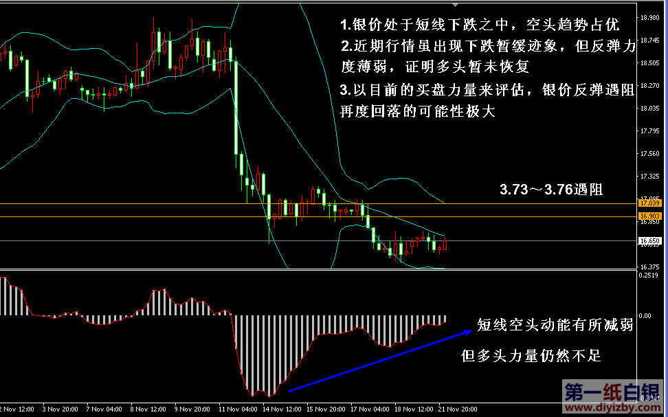 第一紙白銀預計今日市場多:空:震蕩概率為3:3:4。 技術(shù)僅僅是基于概率論和統(tǒng)計學的一種綜合分析手段,絕非預測。所以技術(shù)分析是在考慮做好止損的情況下去博取大概率事件,投資不可過于迷信技術(shù)分析。(短線操作請一定做好止損,一旦被損,代表分析師基于概率和統(tǒng)計的技術(shù)分析不適用于當前行情) 1、紙白銀短線看點位,中線做方向。 2、以上所有價格為工商銀行買入價,即紙白銀低價。進倉點位要再加0.04,出倉則不要。 3、第一紙白銀給出的所有建議僅供投資者參考,不作為下單絕對依據(jù),切勿過于依賴。 4、北京時間08:59發(fā)布此文章。 5、上一交易日白銀價格分析情況:(11月21日)紙白銀短線空頭占優(yōu) 關(guān)注中線支撐力度