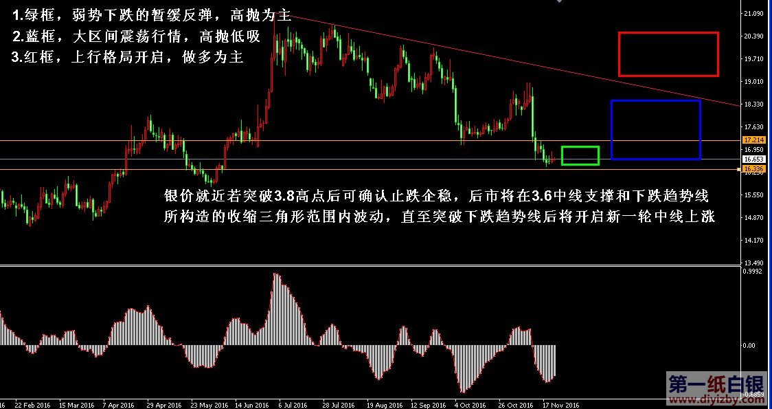 第一紙白銀預計今日市場多:空:震蕩概率為3:3:4。 技術僅僅是基于概率論和統計學的一種綜合分析手段,絕非預測。所以技術分析是在考慮做好止損的情況下去博取大概率事件,投資不可過于迷信技術分析。(短線操作請一定做好止損,一旦被損,代表分析師基于概率和統計的技術分析不適用于當前行情) 1、紙白銀短線看點位,中線做方向。 2、以上所有價格為工商銀行買入價,即紙白銀低價。進倉點位要再加0.04,出倉則不要。 3、第一紙白銀給出的所有建議僅供投資者參考,不作為下單絕對依據,切勿過于依賴。 4、北京時間09:11發布此文章。 5、上一交易日白銀價格分析情況:(11月22日)白銀走勢逐漸轉入震蕩 決議后或完成筑底