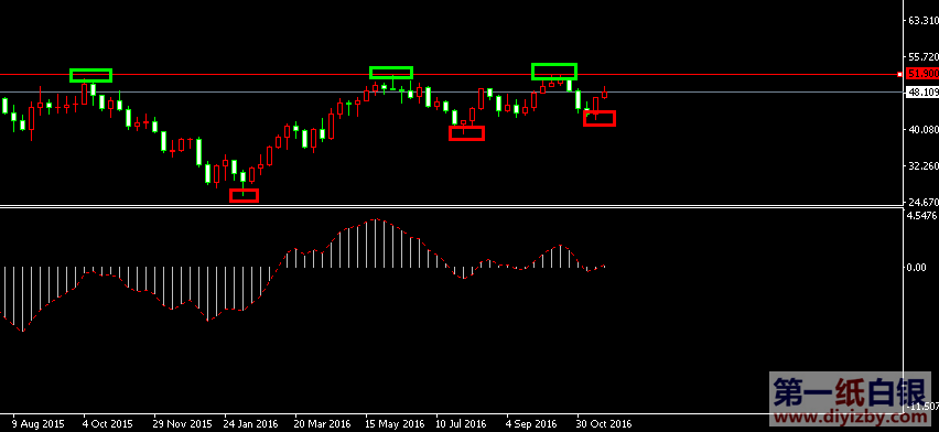 今日下方關鍵支撐3.6附近(關注美元16.35美元附近);今日上方關鍵阻力3.73~3.76(16.9~17美元)、3.8(17.25美元)、3.84(17.4美元)、3.91(17.69美元)、3.97(18美元)、4.05(18.37美元)。 原油:昨日原油沖高后開始首度收陰,其因底背離形態而出現連續拉升,不過近期即將考驗強阻力49.5附近,多頭力量將會出現一定壓制,建議短線多單可在49.5附近做適當分批離場操作,而后持有少量多單保持觀望,后市油價建議回落至43.8~45.6之間可繼續補倉多單。如下圖所示為原油周線走勢圖,油價在52附近因三重頂未突破的因素,上方空間未打開,因此在49.5~52之間屬于較為強的密集阻力帶,此區間內不建議持有重倉多單,可做部分獲利離場。另外,雖然三重頂壓制較強,但后市突破希望仍然較大,圖中紅色框顯示,在三重頂的每次打壓之下,油價的回落低點正不斷抬高,截至此次回落后,其低點所形成的連線和三重頂構成了收縮三角形形態,后市向上突破的概率極大,建議原油回落至43.8~45.6補倉多單,當下可持有少量多單博取后市的中線突破。