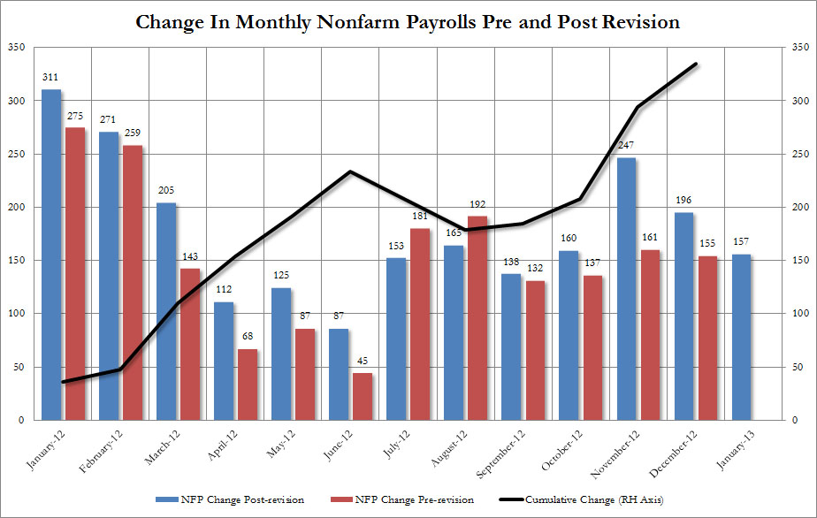 今日數(shù)據(jù)的最大意外之處在于,11月和12月數(shù)值都出現(xiàn)大幅上修,總計(jì)額外增加了12.7萬個(gè)就業(yè)崗位,表明美國勞動(dòng)市場在2012年底出現(xiàn)改善。 這和周三發(fā)布的GDP數(shù)據(jù)構(gòu)成鮮明對(duì)比。周三數(shù)據(jù)顯示,美國第四季度GDP初值萎縮了0.1%,但這可能只是受一次性因素影響。 失業(yè)率從7.8%上升至7.9%,但FT說,很難對(duì)此作出解讀,因BLS對(duì)人口估計(jì)數(shù)進(jìn)行了年度修正。 美國諮商會(huì)(Conference Board)宏觀經(jīng)濟(jì)分析主管Kathy Bostjancic說:“好消息是,1月的就業(yè)增長,以及此前兩月的大幅上修,將意味著更多消費(fèi)支出能力。壞消息是,失業(yè)率依舊居高不下。” Capital Economics首席美國經(jīng)濟(jì)學(xué)家Paul Ashworth說:“在消極的GDP報(bào)告過后,1月就業(yè)報(bào)告應(yīng)該能夠幫助緩解對(duì)美國經(jīng)濟(jì)走向衰退的擔(dān)憂。” 2012年全年,修正后的新增就業(yè)人數(shù)較最初發(fā)布數(shù)據(jù)累計(jì)高出33.5萬人。下圖顯示了修正前后的數(shù)值對(duì)比: