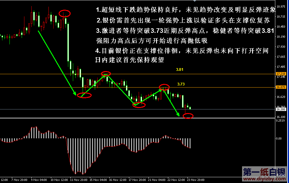 目前紙白銀價格是3.622/克。昨日紙白銀再度走出下跌行情,誠如我們所說,當前銀價因缺乏買盤力量,或出現多次回踩支撐并破位的情況,雖目前走勢圍繞3.6附近的中線支撐停止下跌,但尚未見到明顯的多頭反彈力量出現,投資者仍需繼續保持觀望,直至行情走出一輪強勢上漲并突破近期反彈高點3.73后,走勢方有望逐漸轉入震蕩。如下圖所示為紙白銀4小時周期走勢圖,從超短線趨勢來分析,當前銀價仍然保持著良好的下跌形態,圖中綠色箭頭顯示走勢正處于震蕩下跌格局之中,其中高點和低點均在不斷下移(紅圈),說明下跌形態還未被破壞。雖然目前銀價正處于支撐附近徘徊,但在其未出現明顯反彈之前,尚難以證明買盤力量復蘇,此時投資者暫不可充當先頭兵,建議首先保持觀望,等待一輪強勢上漲出現后,若其能向上突破近期高點3.73(16.9美元)則激進者可開始輕倉回落做多,未來反彈后可嘗試高拋;而穩健者需等待銀價破位3.81(17.25美元)附近的強阻力后,再開始高拋低吸操作。近期銀價已經來到了密集支撐附近,雖然尚未見到明顯反彈出現,但下方空間還未被打開,建議投資者在銀價在未突破3.73之前仍可選擇反彈高拋為主,但需等待反彈拉開空間后方可做空,切不可直接追空,日內阻力位關注3.7~3.71(16.7美元)附近,激進者可在此處輕倉做空,止損3.73上方即可,若被止損則確認短期行情完成“下跌---震蕩”的轉變,屆時可開始高拋低吸策略;反之,若趨勢未改變,則銀價將繼續在阻力位延續跌勢,后市短線空單仍有獲利機會。由于當前高拋低吸空間均較小,穩健者可暫時保持觀望,建議等待行情企穩后再進場操作。綜合分析,當前銀價若不能首先出現一輪上漲突破3.73或3.81兩線,則即使銀價在強支撐附近運行,則投資者亦不可盲目做多。操作的根本仍然依據市場多空力量變化為主,只有順應買賣盤力量變化操作方可順應真正的趨勢,只有賣盤沒有買盤出現之前,盲目做多存在極大的止損風險。(注: 由于紙白銀價格是國際銀價換算而來,而換算過程中涉及到人民幣對美元匯率的變化,即使在國際銀價不變化的情況下,如果人民幣貶值或升值,也會導致紙白銀價格出現變動。因此,我們的分析只采用最新的國際銀價對應的人民幣白銀價格,如與過去分析價格有出入, 投資者應知曉其原因。)