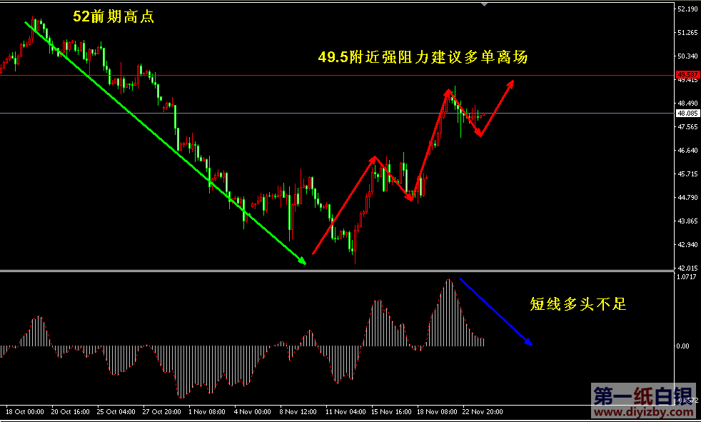 今日下方關鍵支撐3.6附近(關注美元16.3附近);今日上方關鍵阻力3.7(16.7美元)3.73(16.9美元)、3.81(17.25美元)、3.91(17.6美元)、3.97(18美元)、4.05(18.37美元)。 原油:昨日原油收盤十字星保持震蕩走勢,短線行情已經顯示出多頭力量不足的跡象。如下圖所示為原油4小時周期走勢圖,從趨勢來看,前期52高點所引發的一輪回落如果堪稱是主趨勢,則近期行情連續反彈將受到過去下跌趨勢阻力的影響,而49.5正是該下跌的強壓位置。從短線動能形態來看,多頭力量近期震蕩中見到明顯的減弱跡象,暗示有部分多頭開始獲利離場,繼續上沖雖仍有小量空間,但遭遇強阻49.5附近恐面臨多頭集中獲利和空頭增強的情形。穩健者近期建議前期多單在靠近49.5附近做分批離場,等待回落45.6附近及下方重新將多單接回,特別激進者可靠近49.5附近輕倉博短線空單,主趨勢仍然看漲,空單獲利即離場。