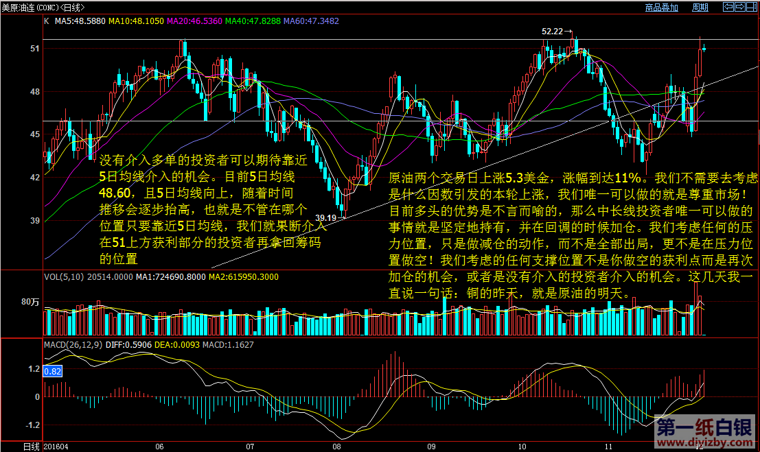 白銀昨日仍然維持震蕩,近期我們始終堅持一個觀點,銀價在區間16~17之間波動時,越跌越買,不要考慮哪個位置破位,就算破位其空間也非常小。所以我們此時應該把白銀的下跌當作是最好的加倉多單的機會。 今日非農同樣以過去的方式應對,可持有一部分多單等待非農出爐,若非農不佳,則銀價下跌過程中繼續加倉,仍然堅定看后期多單有較大的盈利機會。 再來看看原油走勢,原油近兩個交易日上漲了5.3美金,漲幅到達11%。我們不需要考慮是什么因素促使油價上漲,唯一需要做的就是尊重市場。 目前原油多頭優勢不言而喻,中線投資者可以堅定持有多單,并在回落過程中加倉,近期油價所遇到的任何壓力位置,只做減倉動作,而不是全部出局,更不是在壓力位做空。 今日原油輕倉及空倉投資者可在靠近5日均線48.6美元附近介入多單,目前5日均線向上,隨著時間推移會逐漸抬高,也就是不管在哪個位置,只要靠近5日均線,就果斷介入,該點位也是近期在51上方獲利的投資者重新拿回籌碼的位置。 第一紙白銀分析網(m.maomaopao.com)北京時間12:42監測數據,工行紙白銀價格3.656元/克。 本文作者昨日白銀價格分析請看:專家論走勢
