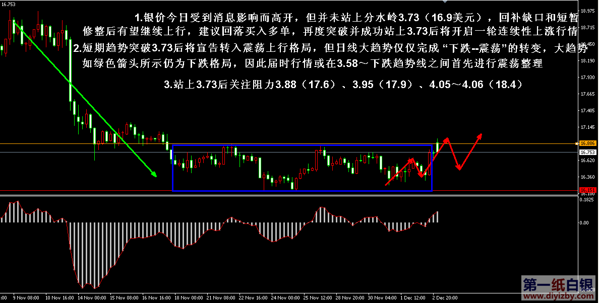 目前紙白銀價格是3.693/克。上周五紙白銀錄得大漲,因非農數據表現不盡如人意,投資者對美聯儲未來長期利率政策產生擔憂,刺激短期避險情緒抬升。周日的意大利公投再次引發金融地震,意大利修憲公投宣告失敗,總理倫齊同時宣布辭職,接下來各政黨需要協調組成新政府,而民粹黨可能取代倫齊的執政地位,此前民粹黨更是爆出,一旦上臺就討論退歐,這也令短期市場避險情緒抬升,周一開盤后金銀價格紛紛高開,但卻未能延續漲勢。值得注意的是,避險情緒或同時推升投資者對于黃金白銀和美元的青睞,此時市場也出現了美元、黃金白銀齊漲的格局,而美元的上漲可能限制金銀的漲幅。就白銀走勢而言,雖其已經破位3.73(16.9美元)的強弱分水嶺,但目前并未完全站上該點位,短線行情回踩后繼續上行的可能性較大,投資者可趁其回補缺口之際嘗試買入多單,后市再度突破3.73并站上該分水嶺后將確認銀價實現突破,屆時行情有望迎來一輪連續性上漲走勢。如下圖所示為白銀4小時周期走勢圖,早盤銀價受到消息面影響而高開,但美元同時上漲對銀價走勢產生打壓,行情高開低走,目前已經完成缺口回補,雖走勢向上高開時突破了3.73(16.9美元)的分水嶺點位,但并未成功站上該阻力,不過后市再度沖擊此處時的空頭力量將明顯減弱,建議投資者回落中買入多單,等待其突破并成功站上該點位后銀價有望迎來一輪連續性上漲的可能性較高;值得注意的是,銀價即使突破強弱分水嶺3.73,也僅僅代表超短線行情轉入震蕩上行,而日線大趨勢只完成了“下跌--震蕩”的轉變,后市行情或首先在區間3.58~下跌趨勢線之間維持震蕩整理,投資者接下來可密切關注上方3.88(17.6)、3.95(17.9)、4.05~4.06(18.4)幾線阻力的強壓,建議在上述點位分批減倉多單,如遇到明顯回落形態或信號,屆時可開始高拋低吸操作。綜合分析,早盤銀價高開后迅速低走,但銀價向上突破并站穩分水嶺3.73的意圖明顯,再度沖擊此處后空頭力量將減弱,建議日內投資者繼續以補倉多單為主,目前走勢完成缺口回補后料將逐漸獲得一定買盤支撐,日內小支撐在3.68、3.63,建議可于上述兩線補倉多單,或在3.63~3.68之間分批加倉。(注: 由于紙白銀價格是國際銀價換算而來,而換算過程中涉及到人民幣對美元匯率的變化,即使在國際銀價不變化的情況下,如果人民幣貶值或升值,也會導致紙白銀價格出現變動。因此,我們的分析只采用最新的國際銀價對應的人民幣白銀價格,如與過去分析價格有出入, 投資者應知曉其原因。)