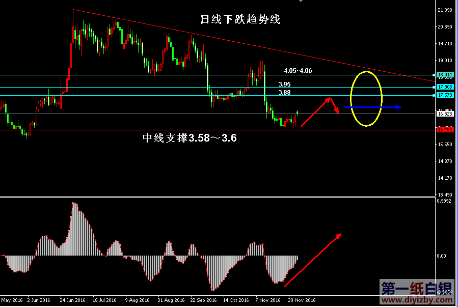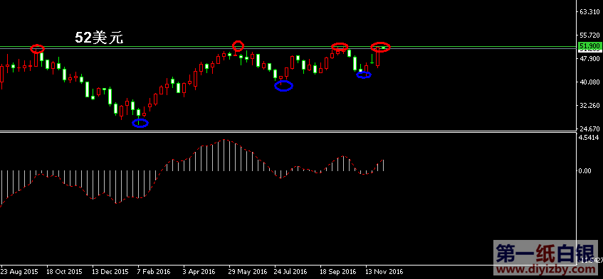 基本面方面:上周五美國勞工部公布的非農數據雖然接近預期,失業率也出現了大幅下降,不過薪資增長卻首度出現負值,這為長期美聯儲加息增添了較大的不確定性,在美聯儲12月加息預期已經消化完畢的情況下,長期利率不能持續走高,打壓了投資者繼續買入美元資產的信心,支撐貴金屬出現反彈。具體數據顯示,美國11月非農新增就業17.8萬人,預期18萬,前值16.1萬;11月失業率4.6%,預期4.9%,前值4.9%,創2007年8月以來最低。相對疲軟的數據為:美國11月平均每小時工資環比-0.1%,預期0.2%,前值0.4%。美國11月平均每小時工資同比2.5%,預期2.8%,前值2.8%。周日時段的意大利公投再度爆出黑天鵝,由于意大利修憲公投失敗,其總理倫齊不得不按照此前的承諾宣布辭職,而辭職引發的一系列蝴蝶效應便可能將意大利推升退歐的境地。現任政府垮臺后,各政黨將協調組成新政府,其中民粹黨可能取代現任總理倫齊領導的民主黨成為執政黨。如此一來,意大利很可能會走上英國退歐的“老路”——民粹黨不僅會呼吁意大利退出歐盟,甚至會主張意大利退出歐元區。受此消息影響,周一早盤金銀和美元雙雙高開,投資者仍需關注后市該消息的進一步發展。今日市場消息較為清淡,投資者一方面重點關注意大利公投的后續進展,另一方面可關注晚間23:00公布的美國11月ISM非制造業PMI和美國11月就業市場狀況指數LMCI。 今日下方關鍵支撐3.58~3.6附近(關注美元16.15~16.25附近);今日上方關鍵阻力3.73(16.9美元)、3.82~3.83(17.3美元)、3.88(17.6美元)、3.97(18美元)、4.05(18.37美元)。 原油:原油大趨勢始終看漲,但短線走勢已經再次到達了三重頂52附近,建議此處投資者可將前期多單部分獲利,持有一定多單博取油價突破52美元的機會,突破后上方空間將被打開。如下圖所示為原油周線走勢圖,如圖中紅圈所示,目前油價所處壓力的52位置,正是過去長期趨勢的三重頂點位,此處無疑具有一定的阻力,但考慮到過去有油價低點不斷抬高(藍色圈),因此以此趨勢推斷,行情向上突破的可能性極大。綜合考慮阻力和趨勢,我們建議投資者部分獲利和部分持有,既能規避風險落袋為安,又能博取油價突破后的一輪較大拉升。若近期原油回落至48美元下方,可在46~48的范圍內分批補倉多單即可。 第一紙白銀預計今日市場多:空:震蕩概率為4:2:4。技術僅僅是基于概率論和統計學的一種綜合分析手段,絕非預測。所以技術分析是在考慮做好止損的情況下去博取大概率事件,投資不可過于迷信技術分析。(短線操作請一定做好止損,一旦被損,代表分析師基于概率和統計的技術分析不適用于當前行情) 1、紙白銀短線看點位,中線做方向。 2、以上所有價格為工商銀行買入價,即紙白銀低價。進倉點位要再加0.04,出倉則不要。 3、第一紙白銀給出的所有建議僅供投資者參考,不作為下單絕對依據,切勿過于依賴。 4、北京時間09:03發布此文章。 5、上一交易日白銀價格分析情況:(12月2日)白銀非農走勢分析預測與操作策略