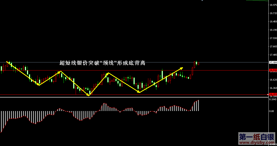 目前紙白銀價格是3.769/克。經(jīng)歷了多日的震蕩盤整,銀價最終向上突破了強弱分水嶺3.73(16.9美元),由此暗示行情超短線圍繞3.58~3.6形成筑底的事實,且日線趨勢完成了“下跌--震蕩”的轉變,銀價未來一段時間將在“3.58~日線下跌趨勢線”所形成的大收縮三角形范圍內(nèi)運行,由于近期走勢距離下一日線壓力位較遠,行情有望迎來短暫的連續(xù)反彈行情,下一目標將主要關注3.87~3.88(17.6美元)附近。如下圖所示為白銀日線走勢圖,參考日線大趨勢格局和近期行情向上突破強弱分水嶺3.73的情況,我們大致可得出如下結論:1.近期行情向上突破強弱分水嶺3.73(16.9美元)后,暗示超短線行情已經(jīng)轉強,銀價有望圍繞3.58~3.6形成底部并迎來一輪連續(xù)性反彈走勢。如圖中黃色箭頭所示,此輪反彈走勢與前期下跌趨勢中的反彈行情形態(tài)較為相似,投資者下一步可重點關注3.87~3.88(17.6)、3.95(17.9)、4.05(18.3)幾線日線趨勢的壓力位,當未來銀價觸及上述點位后,正如圖中黃色和藍色箭頭交界處,投資者需謹防行情受到大趨勢阻力壓制而再度回落的風險,因此我們對超短線走勢的判斷是“先反彈,后回踩”;2.從近期日線的動能指標我們亦可看出相似點,昨日隨著銀價沖破3.73后,動能進入零軸上方開始有放量的跡象,說明多頭力量進一步增強,伴隨其持續(xù)放量,銀價將借助買盤支撐而考驗日線三大阻力3.87~3.88、3.95、4.05幾線的可能性較高,而后才將開始受到空頭強壓影響;3.由圖中的波浪形態(tài)我們還可得知,當前日線趨勢仍然處于下跌格局之中,但短線走勢形成反彈,這是日線下跌趨勢“進三退二”中的退二修正,此時超短線趨勢與日線趨勢發(fā)生不統(tǒng)一沖突,后市反彈遭遇阻力后銀價將首先順應大趨勢而向下運行,至于能否守住底部3.58~3.6目前不得而知,若屆時不再破位該點位,且未來行情有一日向上突破下跌趨勢,則走勢才將完成“震蕩--上漲”轉變。綜合分析,此輪短線反彈將走勢帶入大區(qū)間震蕩格局,但行情并未因此扭轉日線下跌形態(tài)。換言之,日線下跌形態(tài)的改變?nèi)孕桡y價多次沖高和回踩支撐確認不破后才能完成,而當下投資者僅僅以短線先低吸為主,當未來走勢遭遇阻力3.88、3.95、4.05幾線后,投資者可逐漸分批離場,在出現(xiàn)明顯的回落信號后再嘗試高拋操作。注意:今日不可追多,連續(xù)拉升后超短線有回踩的可能性,等待回調后介入多單。(注: 由于紙白銀價格是國際銀價換算而來,而換算過程中涉及到人民幣對美元匯率的變化,即使在國際銀價不變化的情況下,如果人民幣貶值或升值,也會導致紙白銀價格出現(xiàn)變動。因此,我們的分析只采用最新的國際銀價對應的人民幣白銀價格,如與過去分析價格有出入, 投資者應知曉其原因。)