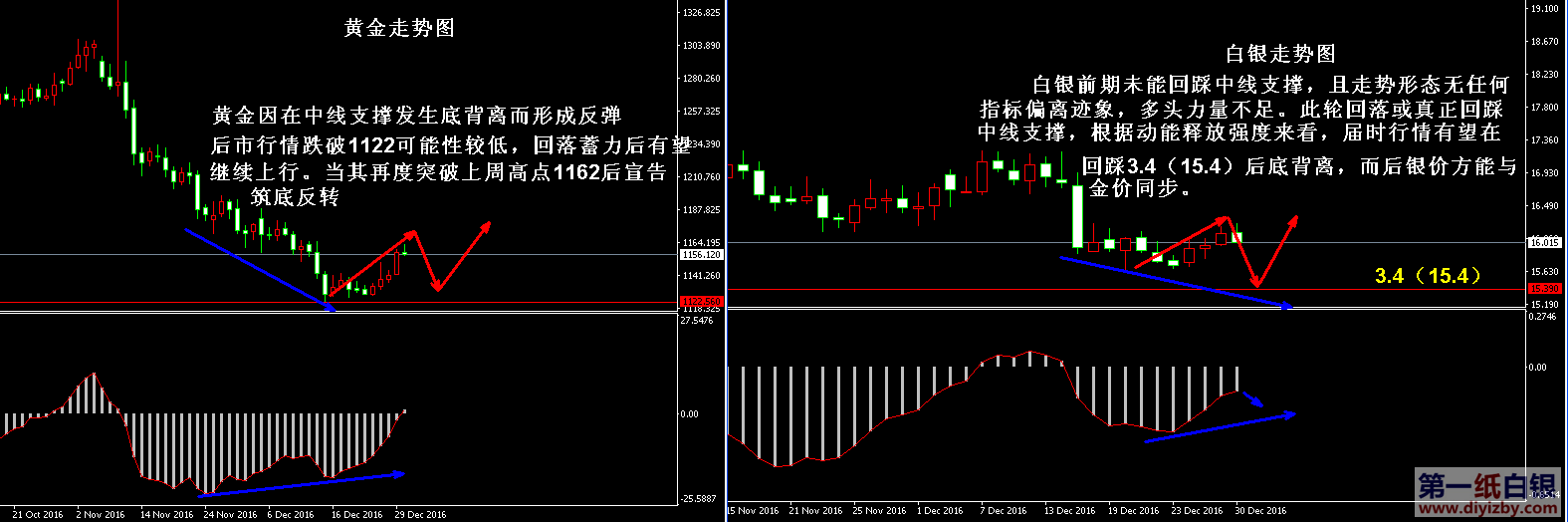目前紙白銀價格是3.540克。上周五白銀價格沖高后回落,從技術形態來看,當前走勢仍未出現明顯的企穩止跌和反轉信號,后市銀價再度向下回踩支撐的概率較大,目前推測銀價仍將運行于弱勢小區間3.4~3.62(15.4~16.28)之間,未突破3.62(16.28)之前,投資者需等待銀價回踩3.4~3.5(15.4~15.7)之間方可低吸做多。值得注意的是,目前黃金走勢強于白銀,雖然二者同時迎來反彈和沖高回落,但投資者可明顯發現,金價上漲幅度較強,且回調力度較弱,而銀價上漲幅度較弱,回調力度較強。究其原因仍是因之前白銀價格未能完全回踩至中線支撐所致,此輪沖高回落若能完成對3.4(15.4)的回踩,則金銀走勢將有望同步。如下圖所示為黃金白銀走勢對比圖,左側黃金因在中線支撐附近底背離發生反彈,其反彈幅度較強,且配合周線形態“早晨之星”可預判金價后市以1122美元為底部的可能性極大,此輪黃金沖高回落幅度預計較小,其在低位蓄力后仍有繼續上行可能,而后當其突破上周高點1162美元后將完全宣告筑底反轉;右側白銀因中線支撐尚未發生回踩,其反彈幅度較弱,且周線和日線形態均為出現任何筑底跡象,因此推測銀價走勢不同于金價。白銀趁此輪黃金回落也會發生回落,但預計跌幅超過黃金,其可能向下再創新低并回踩中線支撐3.4(15.4)附近,而后指標方面才可能出現超賣與底背離,屆時銀價若能守穩3.4(15.4)并再度反彈突破近期高點3.62(16.28),則走勢方能完成筑底反轉。綜合分析,如果從趨勢的形態上來看,黃金和白銀波動的方向是一致的;但從幅度上來看,黃金和白銀將有各自的波動空間,金價預計已經完成企穩的可能性較高,其沖高回落屬于技術性回調概率較大;而銀價尚未完成企穩,其沖高回落或再創新低至3.4(15.4)附近。投資者本周操作上因繼續在區間低位買入多單,或等待銀價回踩完畢后反彈中再進場操作。本周是非農周,白銀走勢有較大概率在本周完成方向選擇,建議投資者密切關注周五非農數據公布。(注: 由于紙白銀價格是國際銀價換算而來,而換算過程中涉及到人民幣對美元匯率的變化,即使在國際銀價不變化的情況下,如果人民幣貶值或升值,也會導致紙白銀價格出現變動。因此,我們的分析只采用最新的國際銀價對應的人民幣白銀價格,如與過去分析價格有出入, 投資者應知曉其原因。)