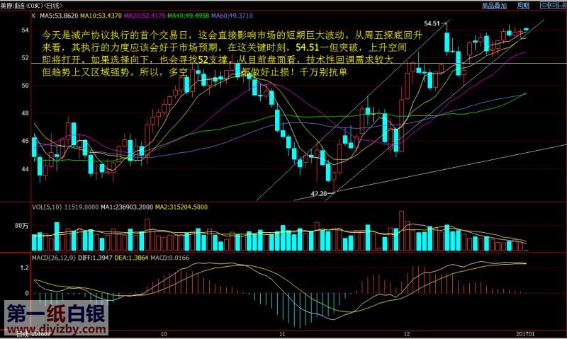 2016年商品牛市令白銀最終年線收漲,2017年我們更加期待牛市延續。白銀目前堅持在16美元下方是很好的中線多單進場位置,今日多單可在該點位下方再次介入,目前投資者只需要堅定回調做多就可以。今日投資者還需重點關注16.2壓力,如果成功站穩,則17區間指日可待。 策略:16下方堅定做多,持有關注16.2突破,看至17阻力。 再來看看原油,今日是原油減產協議執行的首個交易日,這會直接影響市場的短期巨大波動。從上周五油價探底回升來看,其執行的力度應該會好于市場預期,在這關鍵時刻,54.51一旦突破,則原油上升空間將被打開。如果選擇向下,也會尋找52支撐。從目前盤面來看,技術性回調需求大,但趨勢又處于強勢。所以多頭都不好操作,建議突破54.51之前還是等待52下方做多;突破54.51后可以回落分批做多。 策略:突破54.51之前,可等待52下做多;突破54.51后采取分批回落做多。