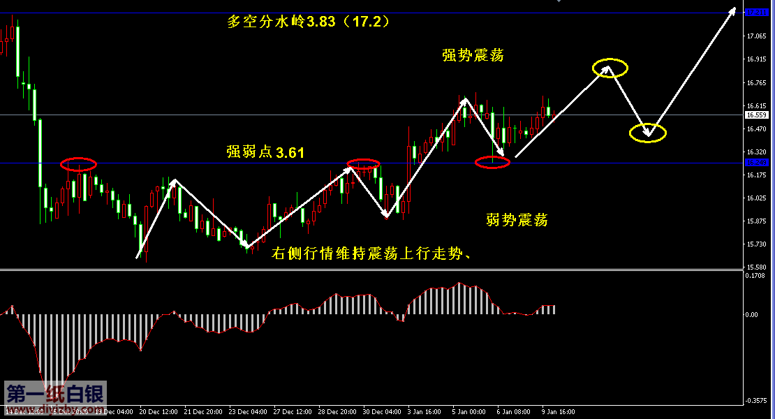 目前紙白銀價(jià)格是3.684克。昨日白銀價(jià)格小幅收陽(yáng),行情正通過(guò)持續(xù)高位震蕩的方式修復(fù)可能帶來(lái)的指標(biāo)偏離,另外通過(guò)高位整理亦可完成新一輪多頭的蓄力,這對(duì)銀價(jià)未來(lái)上行沖擊強(qiáng)阻力帶3.73~3.83(16.8~17.2)將起到積極的作用。目前行情距離該阻力仍有小幅空間,且當(dāng)前銀價(jià)震蕩后指標(biāo)偏離情況有所減弱,后市走勢(shì)將有較大概率繼續(xù)沖擊阻力帶,投資者注意觀察銀價(jià)在該區(qū)間的表現(xiàn),尤其是若見(jiàn)沖高回落,則密切關(guān)注其回落幅度,若能經(jīng)歷一輪空頭力量釋放后企穩(wěn),則第二次沖擊該區(qū)間突破的可能性將增大。如下圖所示為白銀4小時(shí)周期走勢(shì)圖,從超短線銀價(jià)的走勢(shì)形態(tài)我們可以捕捉到諸多信號(hào)和特征:正如圖中紅色圈所示,最早時(shí)候我們?cè)?.61(16.25)作為銀價(jià)的強(qiáng)弱點(diǎn),當(dāng)行情突破該點(diǎn)位后,走勢(shì)進(jìn)入強(qiáng)勢(shì)震蕩區(qū)域3.61~3.83(16.25~17.2)之間,而上周五非農(nóng)日銀價(jià)最低便剛好回踩了強(qiáng)弱點(diǎn)后形成反彈(圖中紅色圈),目前走勢(shì)正有再度向上拉升的意圖。如果以12月最低點(diǎn)至目前價(jià)格繪制波浪形態(tài),我們還可以發(fā)現(xiàn)當(dāng)前銀價(jià)短線正處于震蕩上行步伐之中(白色箭頭),雖然近期行情即將觸及強(qiáng)阻力帶3.73~3.83(16.8~17.2),但該震蕩上行形態(tài)仍然有望保持良好。正如圖中黃色圈所示的假設(shè)形態(tài),銀價(jià)若沖高3.73(16.8)附近出現(xiàn)沖高回落,但其回落后能夠守穩(wěn)3.61(16.25)的強(qiáng)弱點(diǎn),則整體走勢(shì)依舊符合短線震蕩上行的步伐,則后市銀價(jià)再度拉升后將逐漸突破3.73~3.83(16.8~17.2)的可能性亦較高;反之,若銀價(jià)在沖高3.73(16.8)附近后出現(xiàn)了較大的回落行情,跌破3.61(16.25)后將令短線走勢(shì)轉(zhuǎn)入橫盤整理,這可能延長(zhǎng)走勢(shì)低位震蕩蓄力的時(shí)間。綜合分析,銀價(jià)昨日的高位震蕩幫助行情有機(jī)會(huì)延續(xù)短線震蕩上行走勢(shì),但上方阻力較近,投資者暫不可盲目追多,建議持有少量多單保持觀望,等待銀價(jià)觸及區(qū)間3.73~3.83(16.8~17.2)附近后減倉(cāng)或離場(chǎng),若見(jiàn)到明顯的沖高回落信號(hào),則可擇機(jī)高拋,但若見(jiàn)回落中有企穩(wěn)反彈跡象,則立即離場(chǎng)空單,接下來(lái)需等待行情對(duì)于多空分水嶺3.83(17.2)的突破。銀價(jià)一旦突破3.83(17.2),則2017年上半年走勢(shì)必然將重演2016上半年的上漲行情,中線上漲趨勢(shì)將延續(xù)。(注: 由于紙白銀價(jià)格是國(guó)際銀價(jià)換算而來(lái),而換算過(guò)程中涉及到人民幣對(duì)美元匯率的變化,即使在國(guó)際銀價(jià)不變化的情況下,如果人民幣貶值或升值,也會(huì)導(dǎo)致紙白銀價(jià)格出現(xiàn)變動(dòng)。因此,我們的分析只采用最新的國(guó)際銀價(jià)對(duì)應(yīng)的人民幣白銀價(jià)格,如與過(guò)去分析價(jià)格有出入, 投資者應(yīng)知曉其原因。)