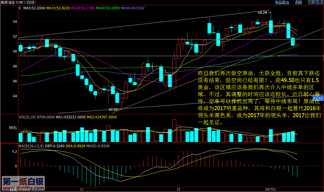 近期白銀面臨較大的方向選擇,如果銀價(jià)繼續(xù)對(duì)17.2~17.3發(fā)動(dòng)沖擊,哪怕是觸及17.2~17.3一下,則后市行情將打破下跌趨勢(shì);反之,如果就此向下,銀價(jià)將仍維持在下降通道之中。 昨日白銀價(jià)格雖然不是大陽(yáng)線收盤,但至少脫離了16.5,再經(jīng)過(guò)2~3個(gè)交易日的震蕩上行,則17.3是有機(jī)會(huì)看到的,沒有到達(dá)之前,多單不宜過(guò)重,并謹(jǐn)慎持有,不要盲目加倉(cāng)。 今日白銀建議觀望,注意是回落還是沖擊17.2~17.3。 目前原油的下跌還沒有結(jié)束,但下跌空間已經(jīng)有限,距離49.5也只有1.5美金,該區(qū)域應(yīng)該是我們?cè)俅谓槿胫芯多單的區(qū)域。不過(guò),其調(diào)整的時(shí)間預(yù)計(jì)較長(zhǎng),近期耐心等待,空單可以擇機(jī)出局觀望,等待中線布局機(jī)會(huì)。 預(yù)計(jì)原油將成為2017年明顯品種,其將和白銀一起替代2016年領(lǐng)頭羊的黑色系金屬,成為2017年的領(lǐng)頭羊。 近期原油亦保持觀望,等待49.5附近后可以開始布局中線多單了。