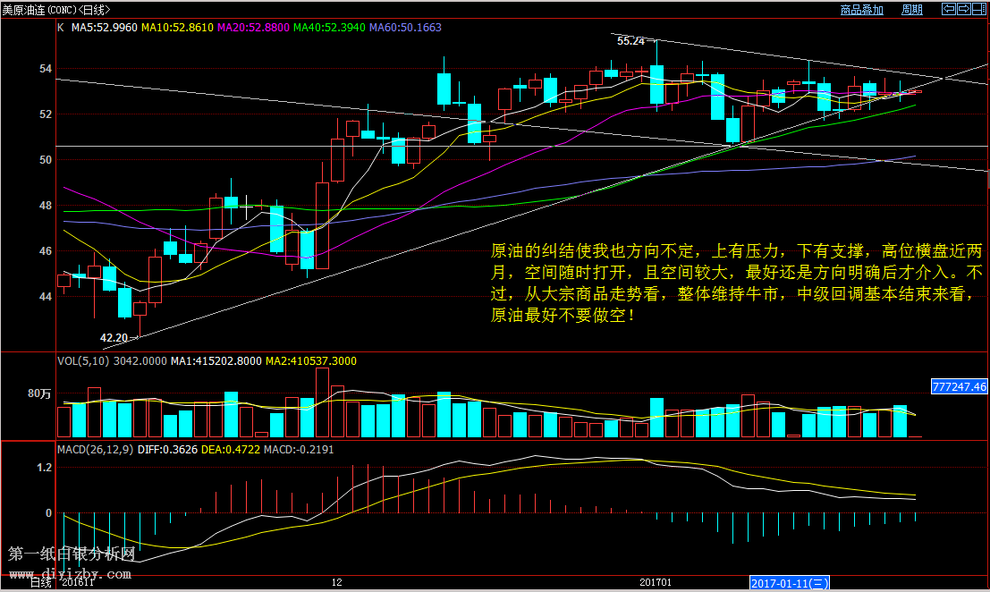 白銀價格昨日下跌后又再次收出長下影線的K線,從2017年白銀歷史走勢來看,下圖顯示了銀價每次收出下影線K線后行情都將繼續上行,這也說明下跌力量不足,且下方買盤力量很強。 歷史是否會重演?不論如何,即使銀價繼續下行調整,其空間也是不大的。建議投資者減持逢低買入是最佳的策略。 今日繼續在回落中分批買入即可,16.8下方介入。 再來看看原油走勢,原油近期糾結方向不定,面臨上有壓力,下有支撐的局面。高位橫盤近2個月,空間隨時打開,且空間較大。最好還是等待方向明確后再進場。不過從大宗商品走勢來看,整體仍然維持牛市,原油建議不要做空。 策略:原油可以在52美元下方布局。 第一紙白銀分析網(m.maomaopao.com)北京時間16:35監測數據,工行紙白銀價格3.748元/克。 本文作者昨日白銀價格分析請看:紙白銀專家論走勢