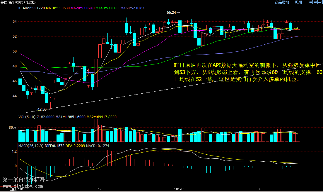 白銀價格昨日最高18.1美元,市場在面臨強壓力的同時,昨日又再創(chuàng)新高。我們在謹慎持有多單中跟隨市場上行。白銀目前在技術指標中長期背離,不斷的拿下一個個高點,再次演繹了技術指標的滯后性。這就是市場趨勢的力量,在如此趨勢下,投資者不可盲目做空。在面臨強壓力區(qū)域,我們可以對多單進行堅持或者可以出局,但一定不可以做空,這是必須執(zhí)行的交易紀律。 目前投資者可等待回落繼續(xù)做多,但堅決不能做空,做多點位在10日均線和20日均線之間17.4~17.7,止損17.2下方,目標18.15。 再來看看原油走勢,昨日原油再次在API數(shù)據(jù)大幅利空的刺激下,從強勢反彈中回到53下方。從K線形態(tài)上看,有再次尋求60日均線支撐的跡象,60日均線在52一線,這也是我們再次介入多單的機會。