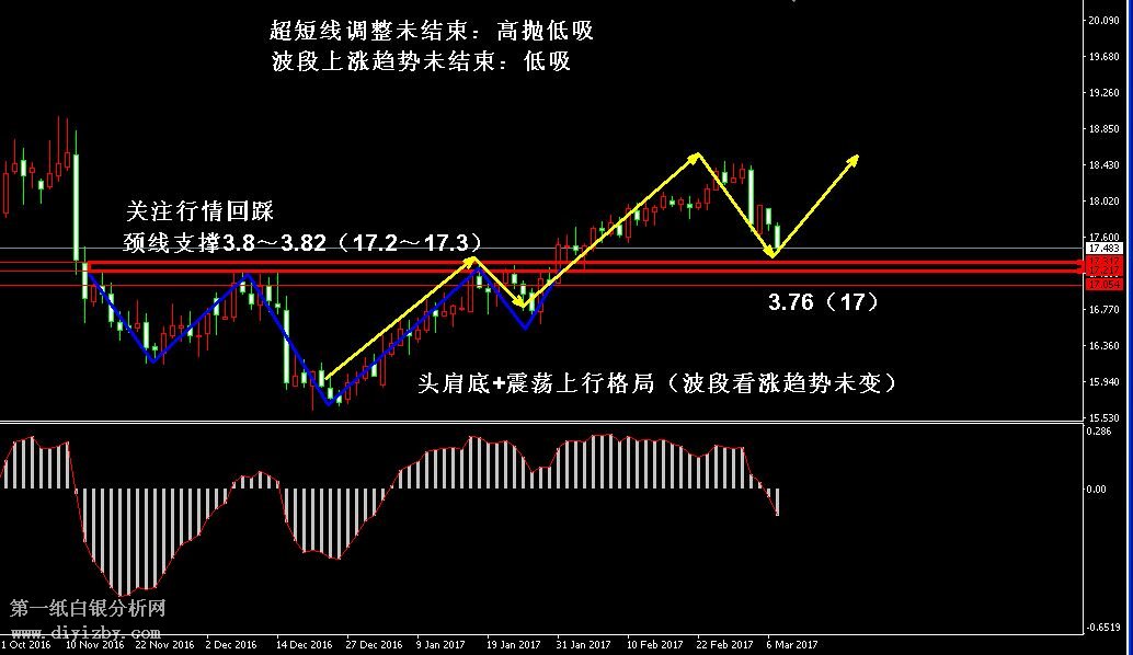 今日下方關(guān)鍵支撐位3.8~3.82(17.2~17.3)、3.76(17);今日上方關(guān)鍵阻3.91(17.7)、3.94(17.85)、3.98(18)、4.03(18.25)、4.05(18.35)、4.18(19)、4.37(19.8)。 原油:原油近期思路維持不變,可繼續(xù)等待區(qū)間49.5~55.2的突破,震蕩時間越久突破幅度越大,屆時突破可直接大幅追單。激進者在突破之前,可在54~55.2高拋做空,止損55.2上方,在49.5~51.5低吸做多,止損49.5下方。由于大趨勢看漲,后市向上突破概率略大,激進者亦可放棄高拋低吸,在52下方分批做多,止損49.5下。 技術(shù)僅僅是基于概率論和統(tǒng)計學(xué)的一種綜合分析手段,絕非預(yù)測。所以技術(shù)分析是在考慮做好止損的情況下去博取大概率事件,投資不可過于迷信技術(shù)分析。(短線操作請一定做好止損,一旦被損,代表分析師基于概率和統(tǒng)計的技術(shù)分析不適用于當(dāng)前行情) 1、紙白銀短線看點位,中線做方向。 2、以上所有價格為工商銀行買入價,即紙白銀低價。進倉點位要再加0.04,出倉則不要。 3、第一紙白銀給出的所有建議僅供投資者參考,不作為下單絕對依據(jù),切勿過于依賴。 4、北京時間07:00發(fā)布此文章。 5、上一交易日白銀價格分析情況:(3月7日)白銀短線關(guān)注信號點突破 波段趨勢仍未變