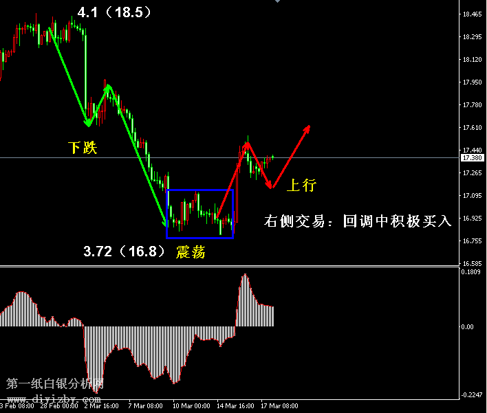 目前紙白銀價(jià)格是3.856克。上周五白銀價(jià)格回踩支撐后觸底收陽,由于整體走勢已經(jīng)完成調(diào)整,在大趨勢看漲的背景下,后市銀價(jià)繼續(xù)向上拉升是大概率事件。目前銀價(jià)處于下跌和上漲轉(zhuǎn)換的初始階段,投資者此時(shí)積極布局多單,一方面點(diǎn)位較低利潤較大,另一方面行情再度大幅回撤的風(fēng)險(xiǎn)也較低。如下圖所示為白銀4小時(shí)周期走勢圖,圖中綠色箭頭---藍(lán)色框---紅色箭頭顯示了銀價(jià)過去由高點(diǎn)4.1(18.5)到目前重新回歸3.8(17.2)上方的變化過程,走勢經(jīng)歷了“下跌--震蕩--上漲”的轉(zhuǎn)變,暗示空頭力量由強(qiáng)轉(zhuǎn)弱,多頭力量由弱轉(zhuǎn)強(qiáng)的變化。另外,由于中線趨勢在年初完成頭肩底形態(tài)后就已經(jīng)筑底,因此短線走勢止跌企穩(wěn)不僅僅暗示行情將上漲,更說明后市上漲高點(diǎn)有望突破前浪高點(diǎn)的4.1(18.5)。當(dāng)前銀價(jià)處于止跌企穩(wěn)的初始階段,下方支撐主要集中于3.8(17.2)、3.76(17),日內(nèi)投資者可在行情回踩上述點(diǎn)位繼續(xù)補(bǔ)倉(上周銀價(jià)已經(jīng)回踩3.8(17.2)完成一次加倉),而后持有多單耐心等待利潤增長,上方目標(biāo)看至3.92(17.7)、3.98(18)兩線。對于波段投資者而言,此輪行情反彈不僅僅是短線銀價(jià)的止跌上行,更是中線行情3浪上漲過程,其最大阻力應(yīng)上移至中線壓力4.18(19)附近。綜合分析,我們之前曾多次提到,2017年上半年屬于震蕩上漲趨勢,特別當(dāng)銀價(jià)完成調(diào)整后,其走勢便進(jìn)入上升趨勢中的上升浪之中,此時(shí)行情的調(diào)整空間將較小,行情將主要以單邊上行打開空間為主。故而無論短線投資者還是波段投資者,均應(yīng)在行情出現(xiàn)任何回踩小調(diào)整中積極買入多單,等待利潤逐步擴(kuò)大。(注: 由于紙白銀價(jià)格是國際銀價(jià)換算而來,而換算過程中涉及到人民幣對美元匯率的變化,即使在國際銀價(jià)不變化的情況下,如果人民幣貶值或升值,也會(huì)導(dǎo)致紙白銀價(jià)格出現(xiàn)變動(dòng)。因此,我們的分析只采用最新的國際銀價(jià)對應(yīng)的人民幣白銀價(jià)格,如與過去分析價(jià)格有出入, 投資者應(yīng)知曉其原因。)