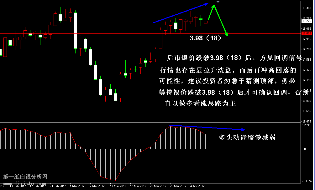 2、以上所有價(jià)格為工商銀行買入價(jià),即紙白銀低價(jià)。進(jìn)倉點(diǎn)位要再加0.04,出倉則不要。 3、第一紙白銀給出的所有建議僅供投資者參考,不作為下單絕對依據(jù),切勿過于依賴。 4、北京時(shí)間07:10發(fā)布此文章。 5、上一交易日白銀價(jià)格分析情況:(4月6日)白銀多頭力量略有減弱,未見信號前不可沽空