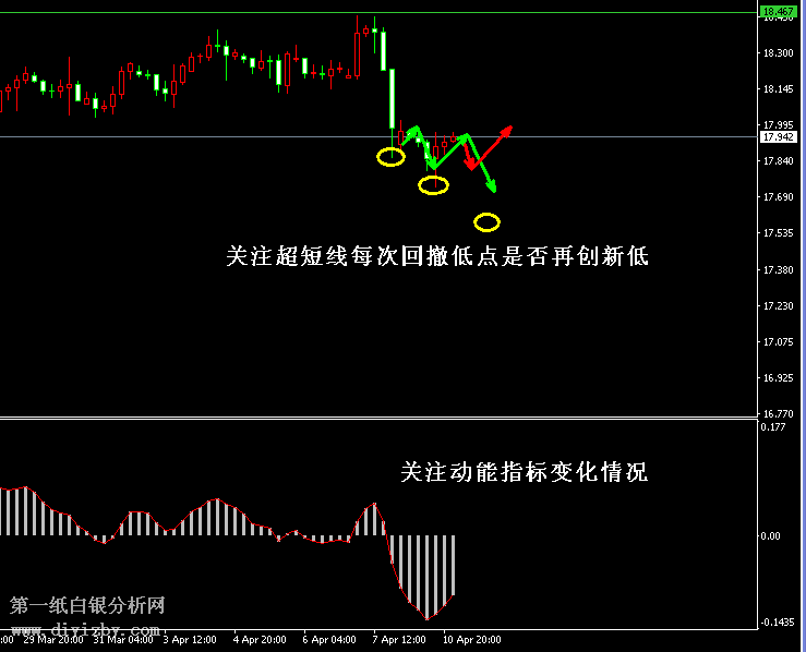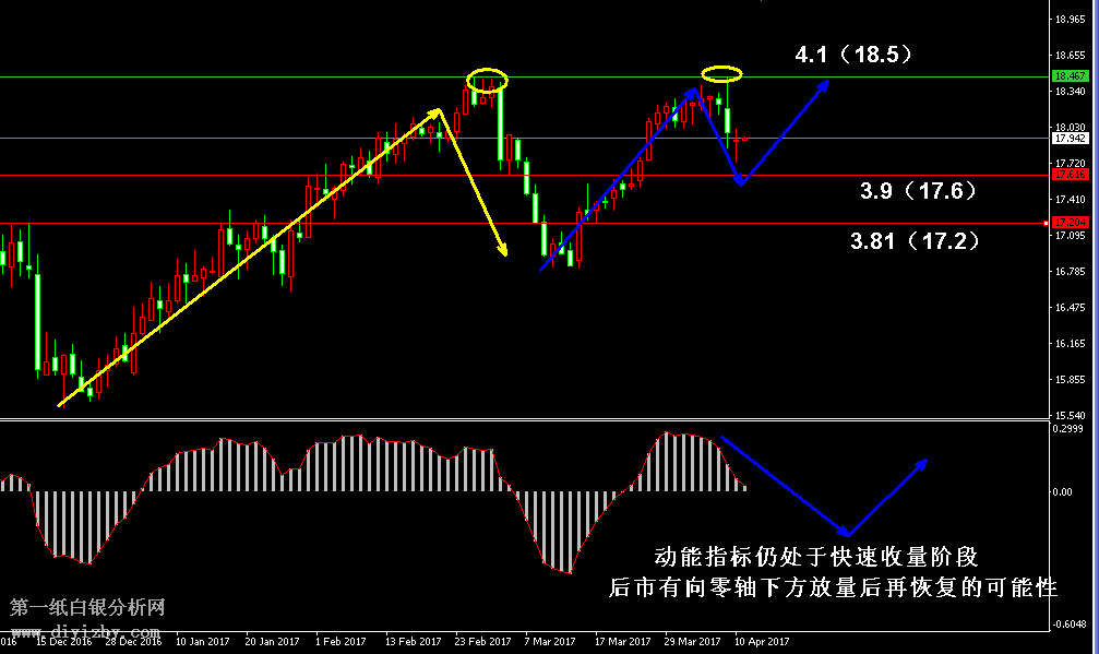 今日下方關鍵支撐位3.9(17.6)、3.85(17.4)、3.81(17.2)、3.72(16.8);今日上方關鍵阻4.01(18.1)、4.05(18.3)、4.1(18.5)、4.18(19)。 技術僅僅是基于概率論和統計學的一種綜合分析手段,絕非預測。所以技術分析是在考慮做好止損的情況下去博取大概率事件,投資不可過于迷信技術分析。(短線操作請一定做好止損,一旦被損,代表分析師基于概率和統計的技術分析不適用于當前行情) 1、紙白銀短線看點位,中線做方向。 2、以上所有價格為工商銀行買入價,即紙白銀低價。進倉點位要再加0.04,出倉則不要。 3、第一紙白銀給出的所有建議僅供投資者參考,不作為下單絕對依據,切勿過于依賴。 4、北京時間07:00發布此文章。 5、上一交易日白銀價格分析情況:(4月10日)白銀短線或維持調整 中線看漲趨勢仍不變