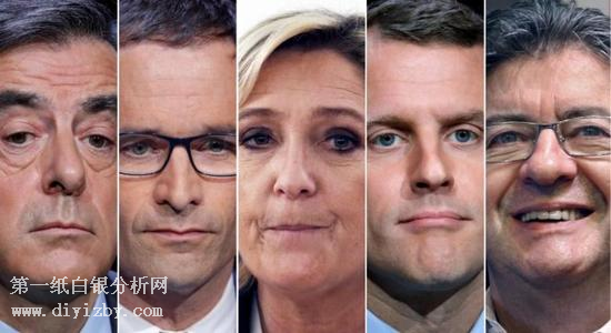 (圖示:從左到右,菲永,哈蒙,勒龐,馬克龍,梅朗雄)